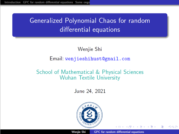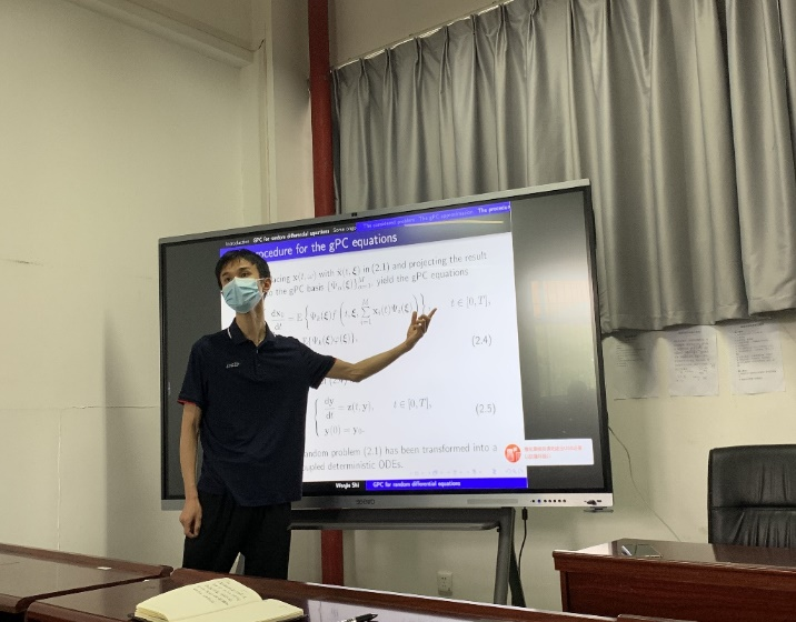 史文杰博士进行了题为“Generalized Polynomial Chaos for Random Differential Equations”的报告。报告介绍了不确定性量化研究领域尤其是 gPC方法的研究背景,讲解了gPC方法求解随机微分方程的一般步骤,包括:gPC逼近原理、gPC方程的导出、以及gPC方程的数值求解等相关问题,并进一步介绍了他目前正在开展的一些相关工作的研究情况。最后,老师们就相关问题进行了充分的交流和讨论。