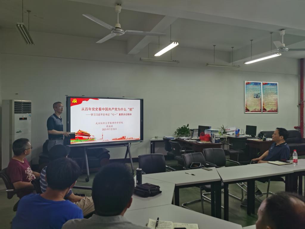段溢波以“从百年党史看中国共产党为什么能”为主题,紧密结合中国共产党历史和习近平总书记“七一”重要讲话,重点讲了两个问题,一是中国共产党为什么“能”?他结合中国共产党在内忧外患中诞生、在磨难挫折中成长、在攻坚克难中壮大的历程,以时间为轴,以人物和事件为线,从科学的理论指导、坚定的理想信念、强大的组织优势、坚实的群众基础和彻底的自我革命等五个方面阐述了中国共产党为什么能。二是williamhill英国怎样才“行”?结合习近平总书记提出的“伟大建党精神”和中国共产党为什么“能”,从六个方面提出了要求。其一,抬头看路与低头做事相结合。路就是坚持真理、坚守理想,就是国家的方针政策,就是学校、学院的制度、规定。当务之急是对照学校规划,拟定学院的“十四五”规划和年度考核办法。其二,严密的组织体系与严明的组织纪律相结合。健全学院各类组织,严肃政治纪律和政治规矩。其三,高尚师德与扎实学识相结合。明大德、对党忠诚,守公德、为师生服务,严私德、廉洁自律。在教学、科研等方面有所建树,发挥自己潜能和特长。其四,小我与大我相结合。在做好自己的同时,牢记江山就是人民,人民就是江山,打江山、守江山,守的是人民的心,要把师生放在心上,不负师生。其五,教书育人与自我革命相结合。践行教育初心,担当育人使命。勇于自我净化、自我完善、自我革新、自我提高。其六,敢于斗争与善于斗争相结合。正确把握当前形势,坚定有力开展意识形态的斗争,扎牢网络意识形态责任制。做到头脑要清、视野要广、肩膀要硬、步子要稳、腰板要正。