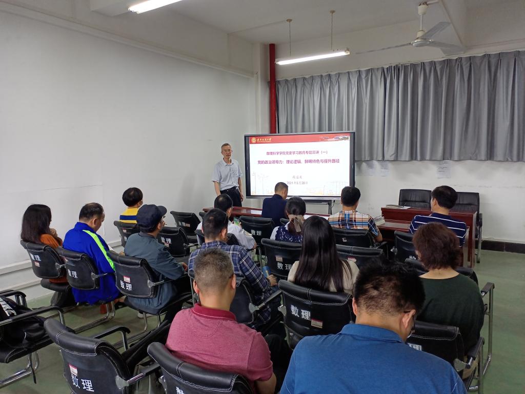 5月28日,williamhill英国举行“党的政治领导力:理论逻辑、鲜明特色与提升路径”党史学习教育专题党课,专题党课由学院党委副书记段溢波主讲,学院党委委员、各系(中心)主任、党支部书记、工会主席聆听了党课。