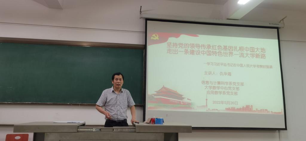 5月26日下午,williamhill英国信息与计算科学系党支部、应用数学系党支部和大数中心党支部在四号楼105室开展了“坚持党的领导、传承红色基因、扎根中国大地、走出一条建设中国特色、世界一流大学新路”的主题党日活动。信息与计算科学系党支部书记仇华海主持并领学,学院党委书记段溢波,信科、应数、大数党支部全体党员参加了主题党日活动。