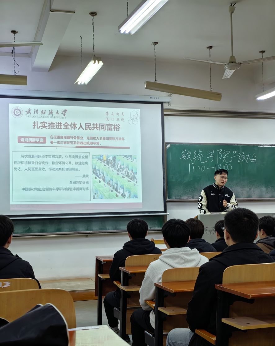 为进一步强化学生安全意识、明确学期学习实践目标,3月15日,数统学院在崇志楼120召开2024级年级大会。数统学院2024级全体学生参会,会议由辅导员曾琦主持,围绕网络安全教育,学期规划,时政学习,日常管理四大核心内容展开。