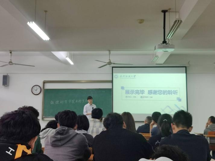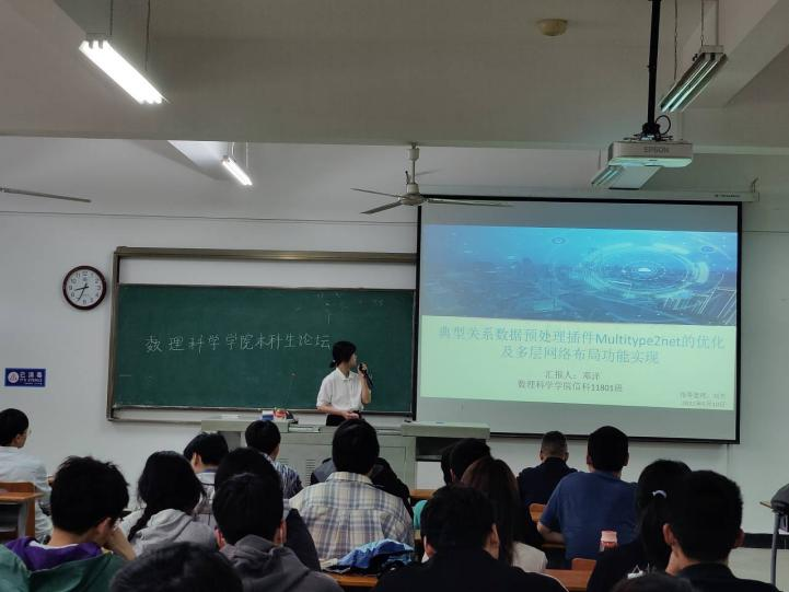 4名18级本科生做出了主题报告。信科11801班龚新迁同学最先向我们展示了“复杂权重网络的拓扑特征研究”,并就其从“选题背景”,“研究意义及实现应用”,“主要加权指标简述”,“评价指标”四个方面层层深入进行了讲解。信科11801班张静同学报告了“有色金属上市公司财务业绩分析”,该同学从“选题论述”,“论文经过”,“实验过程”,“课题结论”四方面向出席人员进行了详细的介绍。信科11801班邓洋同学以“万物皆有网络关系”为研究背景介绍了“典型关系数据预处理插件Multitypeznet的优化及多层网络布局功能实现”,简洁明确地展现了细节步骤。最后,信科11801班孙驰同学汇报了“基本Rxjava和Retrofit框架的音乐播放app的设计和实现”,并详细介绍了该app的开发背景,开发工具及技术简介,系统设计与实现系统测试,总结与改进等。