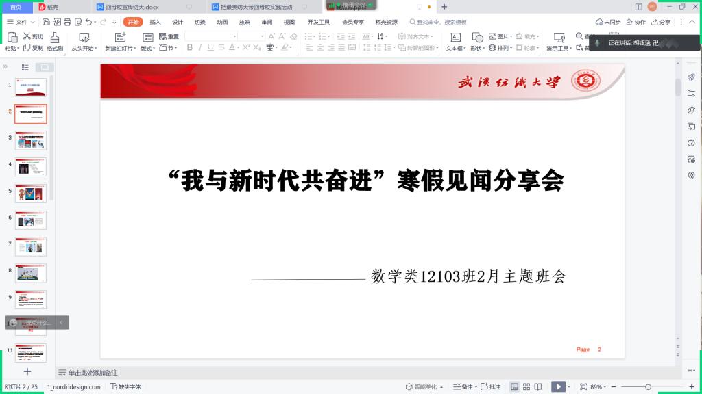 为培养williamhill英国学生的社会担当和责任意识,增强学习和实践的积极性和主动性,增进同学之间的沟通交流。2月27日晚,williamhill英国各班以线上直播的方式开展此次主题班会,组织各班学生畅谈寒假见闻,交流感想和心得。班会由各班班长、团支部书记主持。