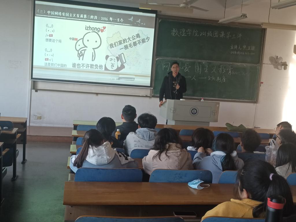 辅导员指出,同学们要了解爱国主义的特点以及网络爱国主义的定义,他呼吁同学们都要有强烈的爱国主义精神;在此之后,他带领同学们全面回顾了中国网络爱国主义发展的三个阶段,系统梳理了网络爱国主义教育的兴起发展。他强调,关于网络爱国主义的三个标志性事件,分别是1999年中国驻南斯拉夫大使馆被炸事件、2008年西藏3.14打砸抢事件、2019年港独事件,让同学们对网络爱国主义有了更为深刻的认识。团课接近尾声,辅导员介绍了B站中ACG元素的运用和“鬼畜”剪辑手法的使用,并带领同学们观看了关于“七尺之躯 已许国 再难许卿”的热血视频。