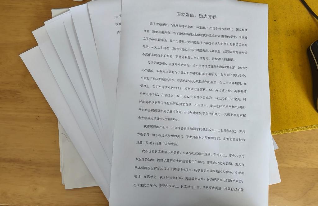 6月1日-6月10日,学院面向获得国家、学校奖助学金优秀学生征集感恩书信,同学们积极踊跃参加,一份份感恩书信是一份份浓厚深情。微电子12202班罗同学在感恩书信中写到:“山的那边,有光,是繁荣的祖国和美好的未来,我将怀着这份信念不断前行,努力成为照亮世界的一束光。”国家向我们播撒甘露,我们以青春奋进之姿助力国家新征程。