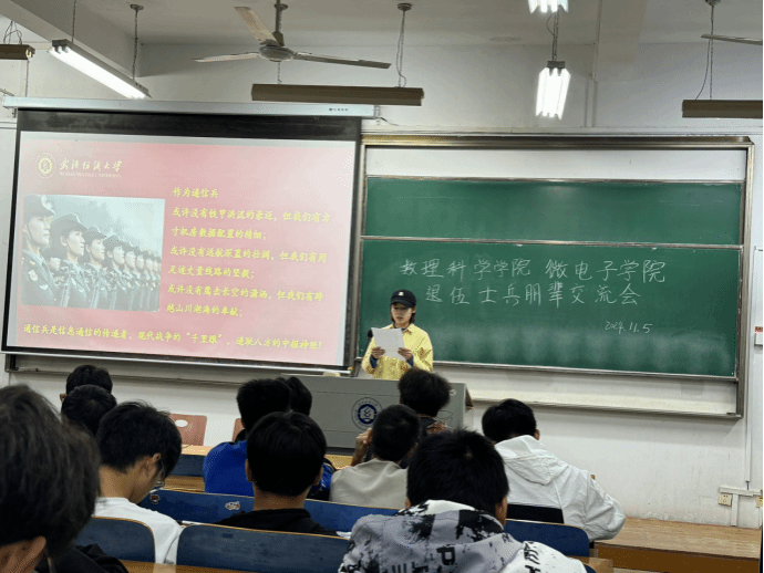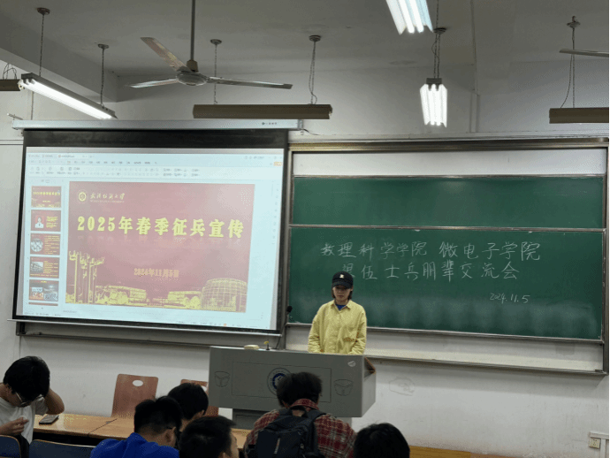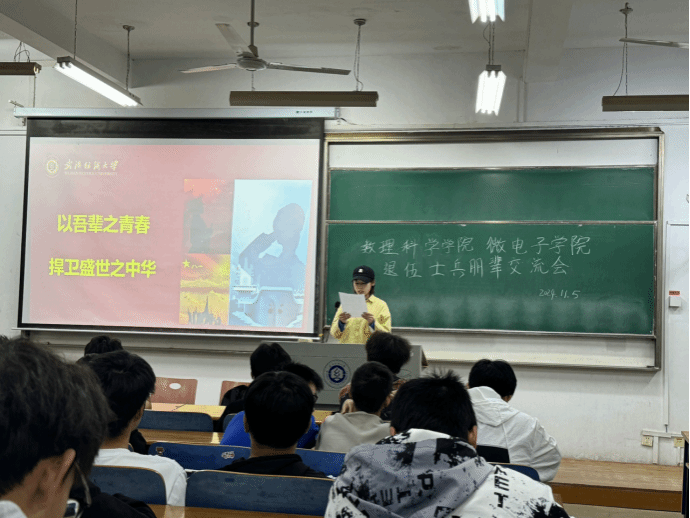 为切实加强征兵宣传工作,激发广大青年学生的参军热情,11月5日晚,williamhill英国、微电子学院在G03 - 511教室举行了一场别开生面的退伍士兵朋辈交流会。此次会议吸引了数学12403班、12404班以及微电子12401班、12402班的全体男生踊跃参与,会议由williamhill英国应数12201班的周钰琳同学主持。