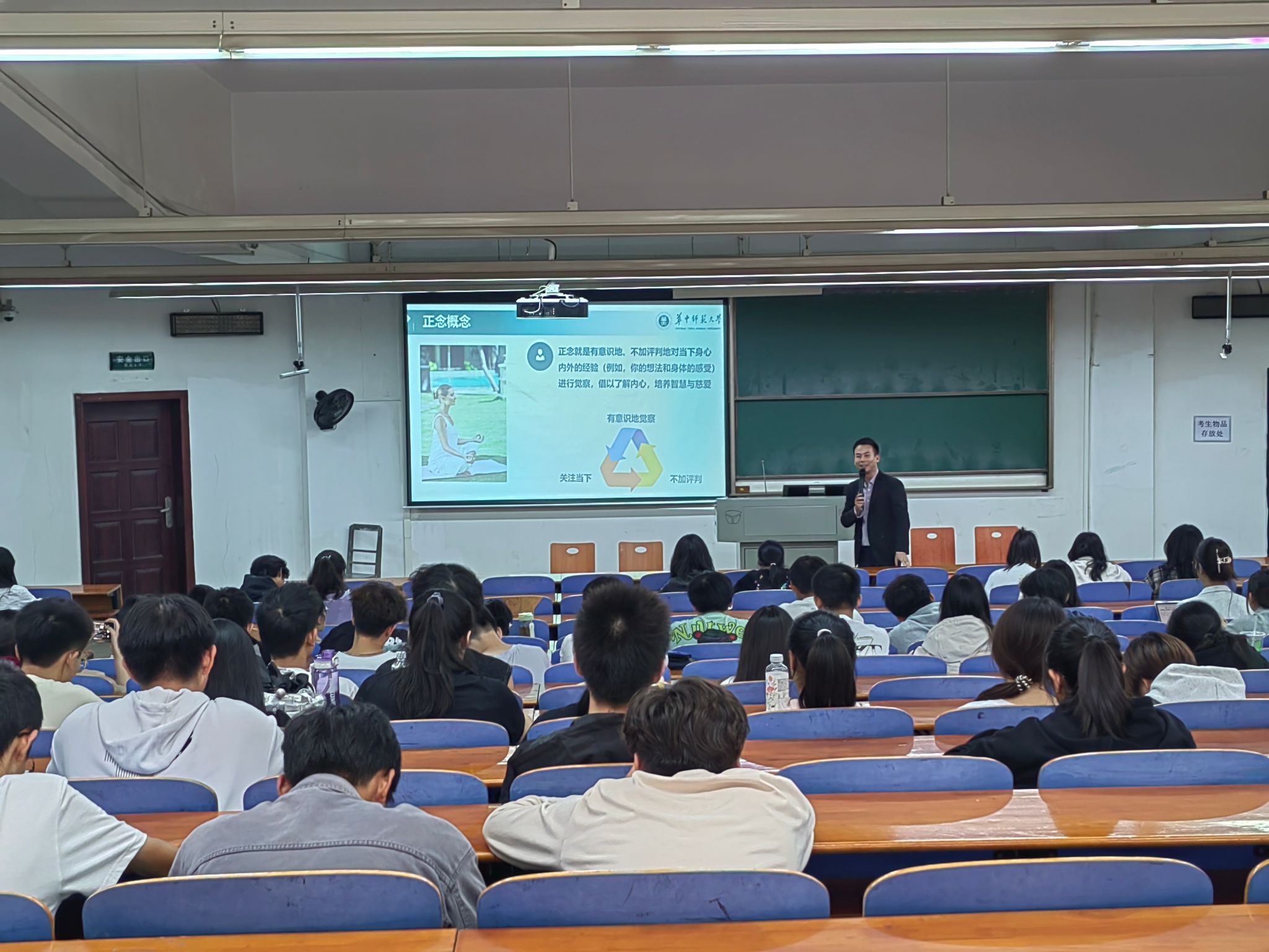 同时,骆老师列举了乔布斯、曾国藩等人的例子带大家更好的体会这一方式,他强调:“正念是一种专注于当下、不加评判的觉察能力,它能够帮助我们更好地认识自我,理解情绪,从而实现心灵的平和与自我成长。”他通过引导学生进行现场的正念练习,让学生体验到了正念带来的内心宁静和力量。