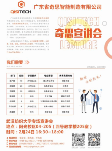 2月24日,学院在四号教学楼205室举办专场招聘宣讲会,邀请到广东奇思智能制造公司人力资源部张总、陈总、叶总为同学们宣讲。