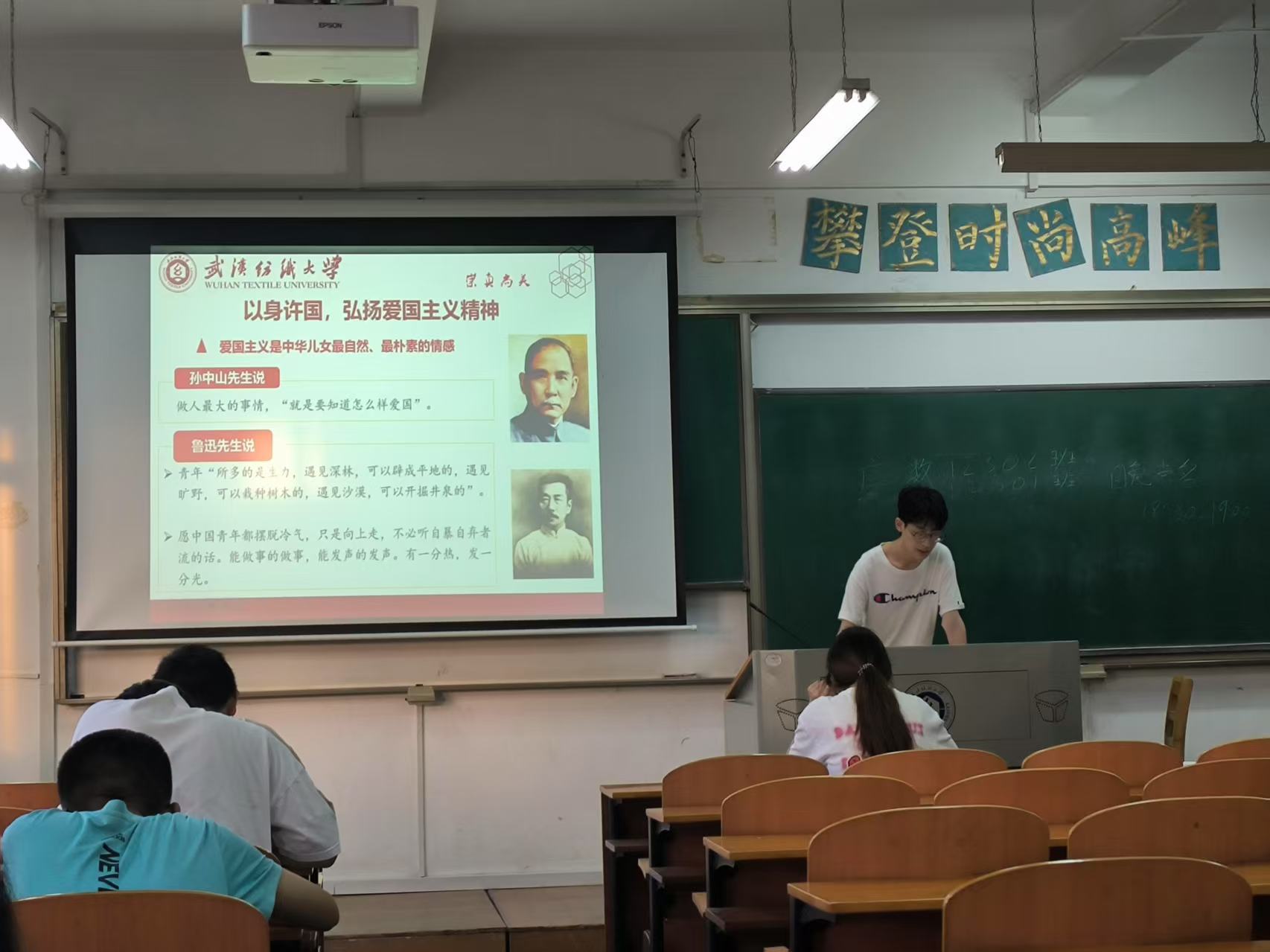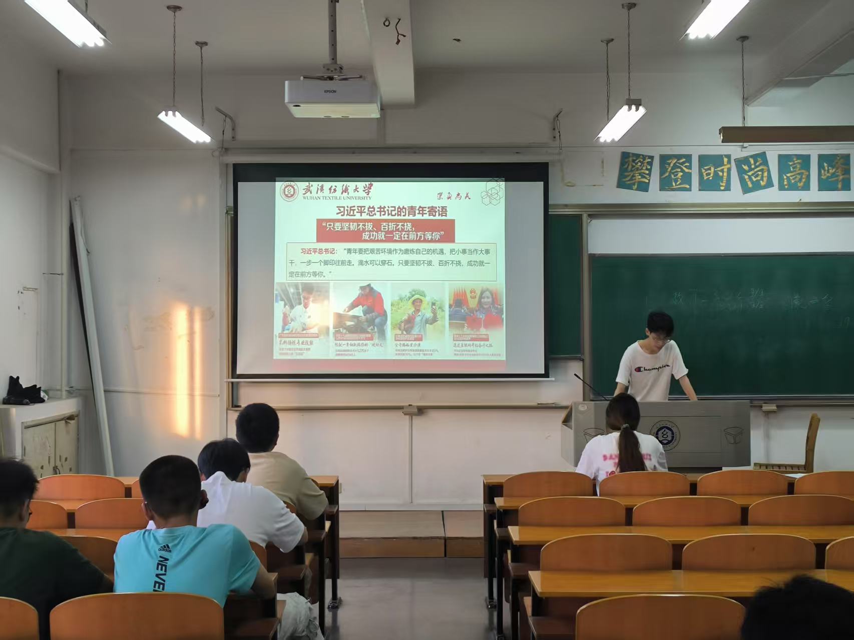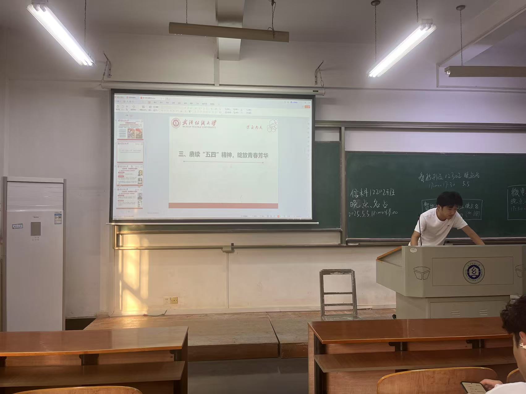 最后,联系实际生活,班委向同学们列举纺大青春榜样的事例,学习各教授、学长学姐们的感人事迹,让同学们对五四精神的力量有更加深刻的感悟,从而激发我们顽强拼搏挥洒青春的斗志,用脚踏实地的奋斗书写我们的青春华章。
