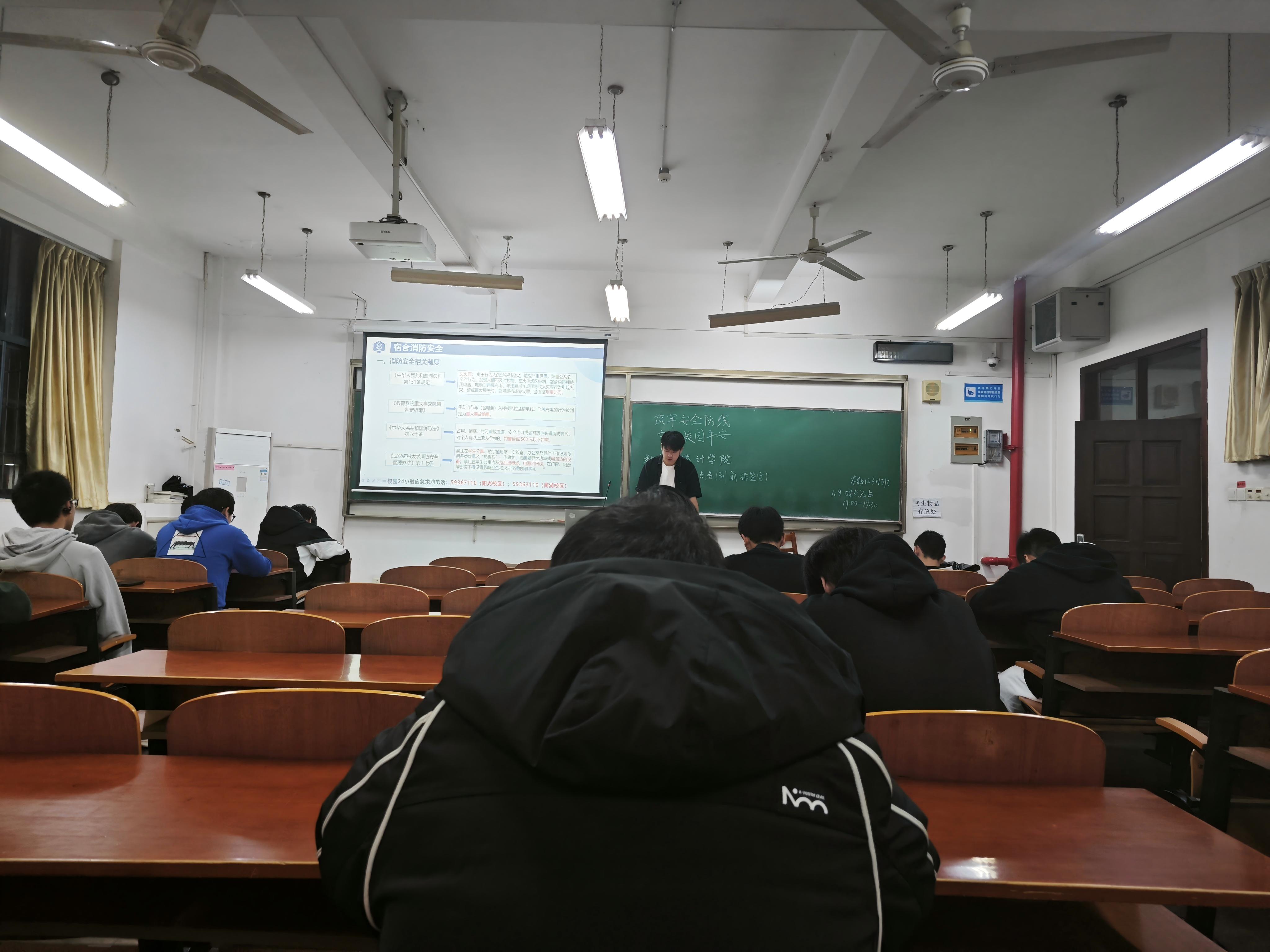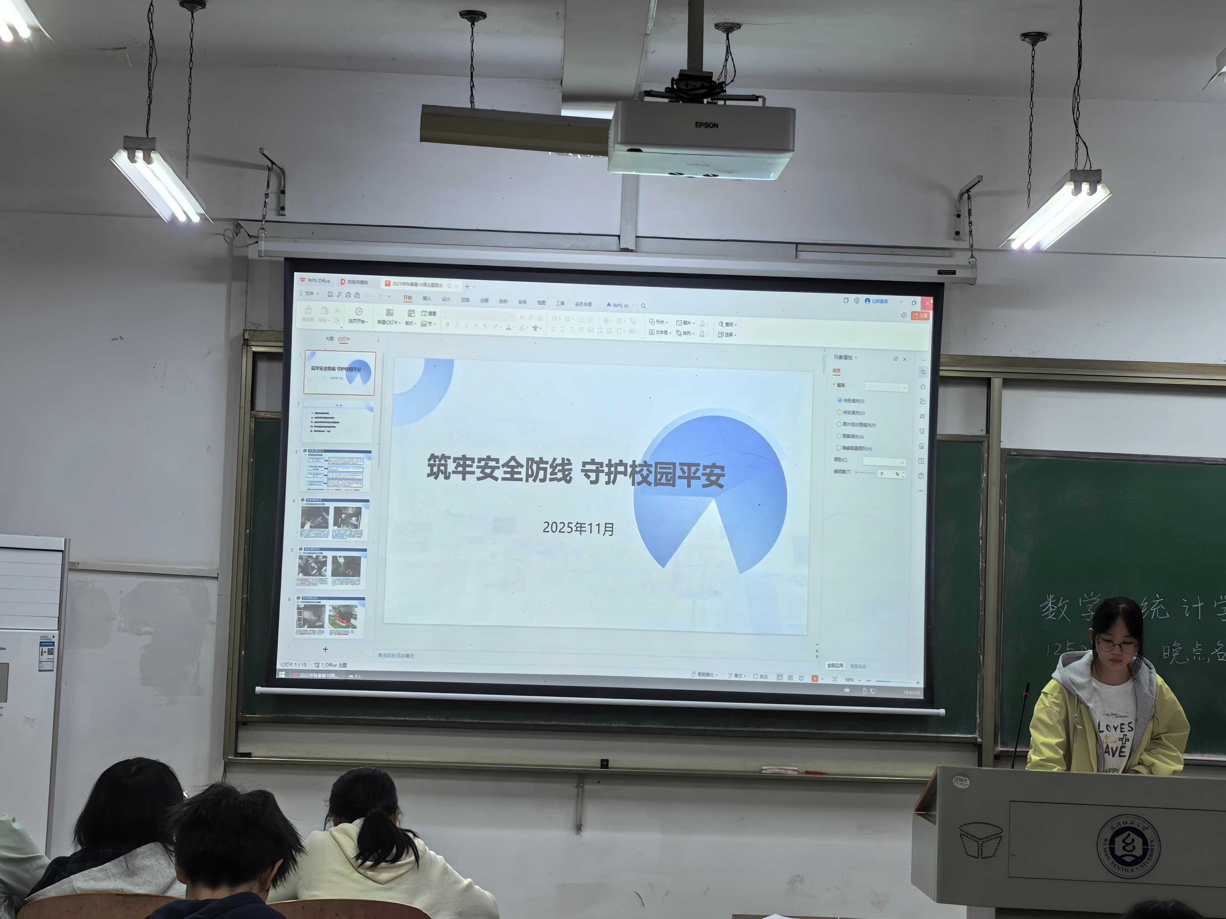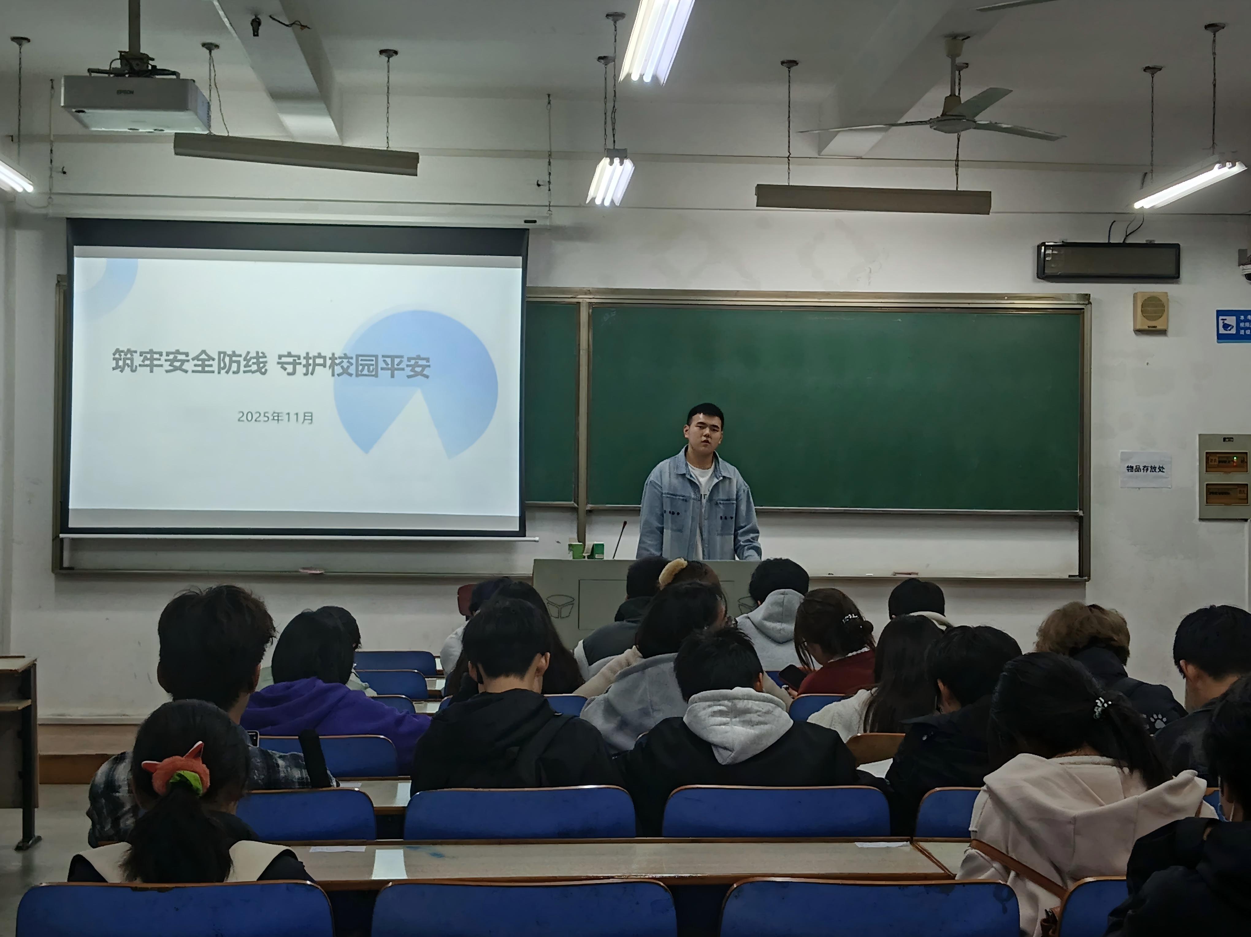 为进一步提升学生安全意识,增强校园安全保障能力,数学与统计学院于2025年11月在崇志楼开展了以"筑牢安全防线 守护校园平安"为主题的安全教育班会。此次班会全体同学参加,班会由各班班长主持。