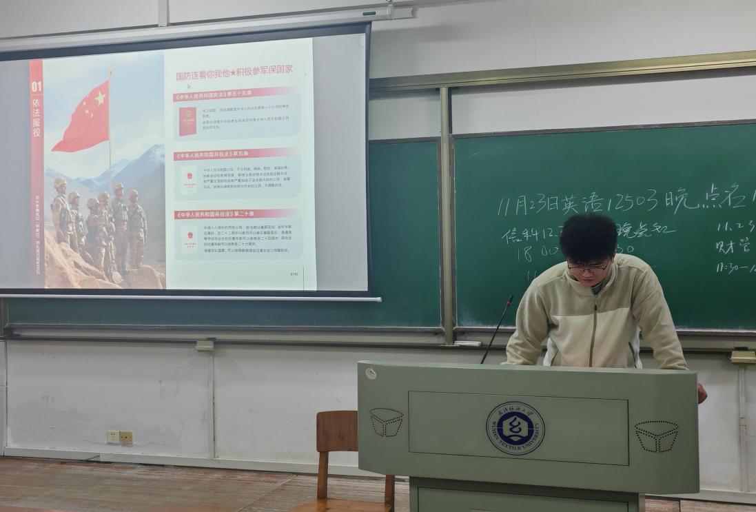 为让同学们对国防建设、参军入伍有更全面的认识和更深刻的感悟,数学与统计学院于2025年11月23日在崇志楼开展了以“携笔从戎立青春,热血报国正当时”为主题的班会,班会由各班班长主持,全体同学参加。