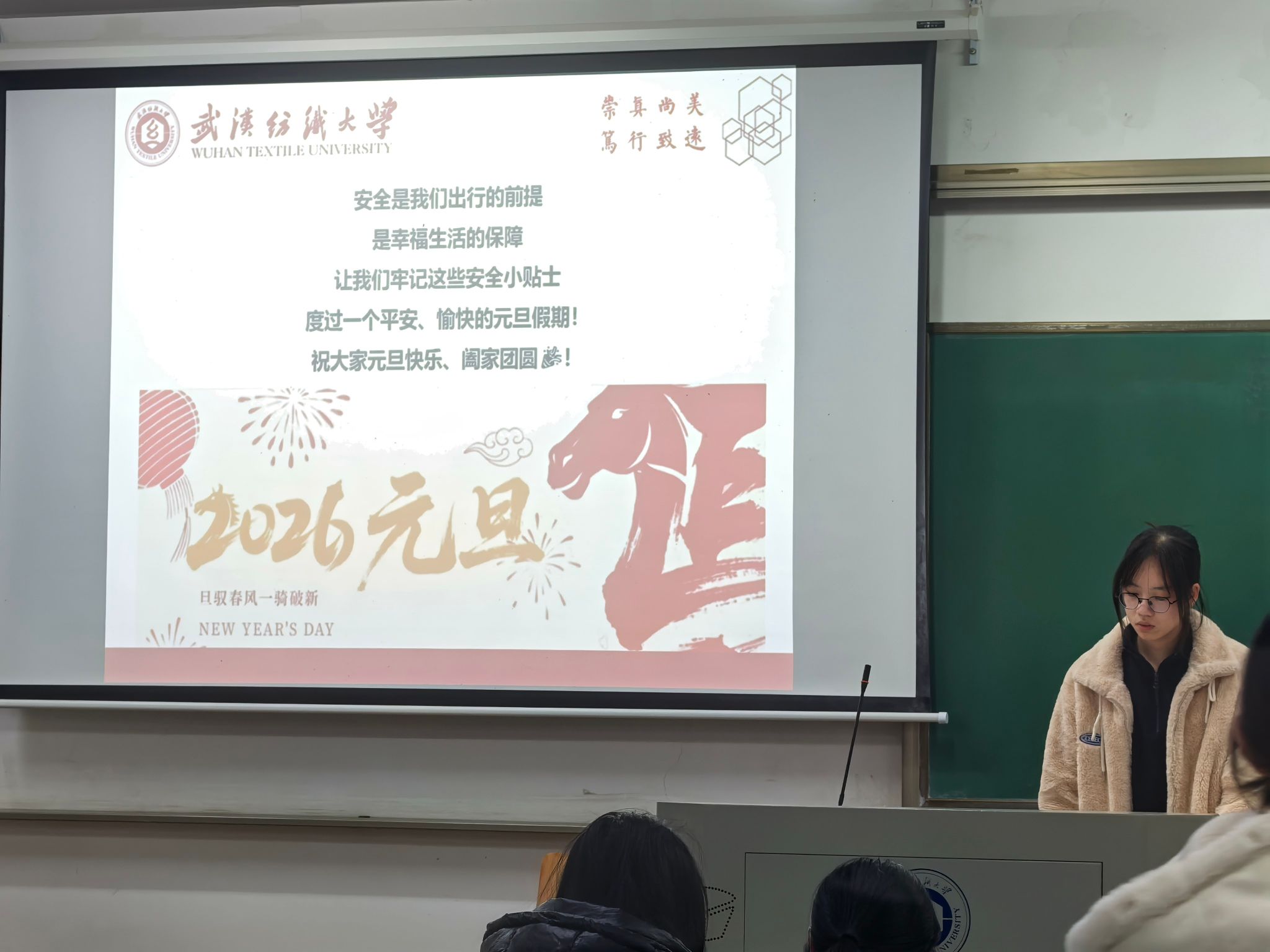 元旦的脚步悄然临近,安全文明的警钟时刻长鸣。12月28日,武汉纺织大学数学与统计学院在崇志楼开展了一场以“辞旧迎新庆元旦,安全文明伴我行”为主题的班会活动。各班班长结合元旦假期特点,为同学们讲解假期安全注意事项与文明行为准则,同学们认真聆听讲解、积极参与互动讨论,在新年将至的氛围中,筑牢安全文明意识防线,为度过平安祥和的元旦假期打下坚实基础。