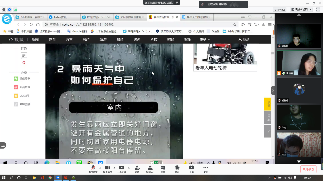 期间,辅导员提出,目前疫情形势严峻,暂未完成社会实践的学生,可选择线上社会实践,并完成社会实践报告的撰写。另外,因目前疫情导致家庭资金紧缺的学生家庭,可向学校提交临时困难补助申请材料,学生资助管理中心会根据学生实践情况给予一定资助。并对做好近期强降雨天气防范列出应对提示。