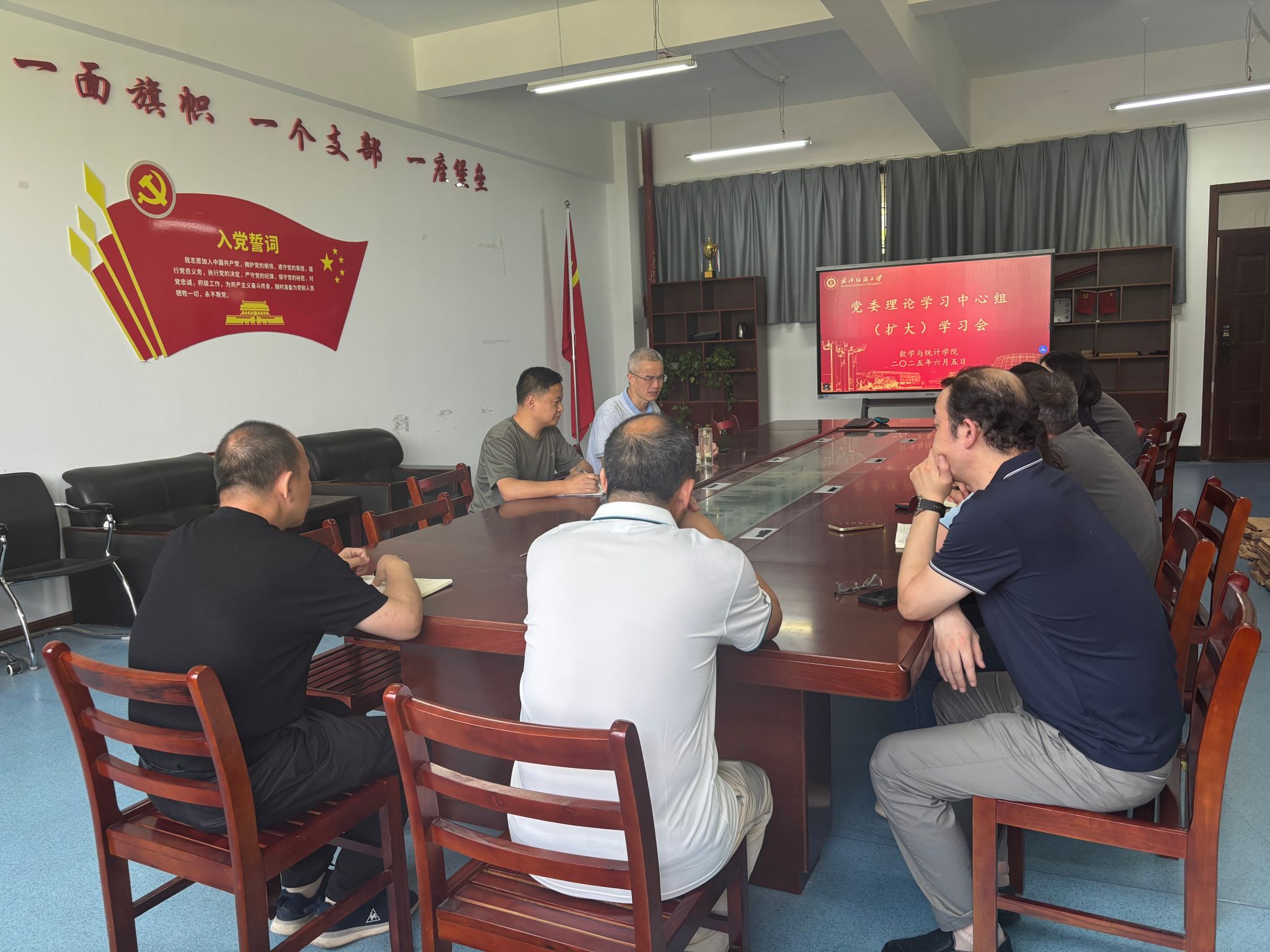 2025年6月5日下午,数学与统计学院在阳光校区4号教学楼102室召开党委理论学习中心组(扩大)第五次会议暨“学查改”专题学习班第四讲。学院班子成员、党委委员、系(中心、办)主任、党支部书记、教授委员会主任、教学督导组长、团队负责人参会,大学数学中心主任王洪山以《破釜沉舟踔厉奋发 团结奋斗砥砺前行》为题做专题报告,学院党委书记段溢波主持。