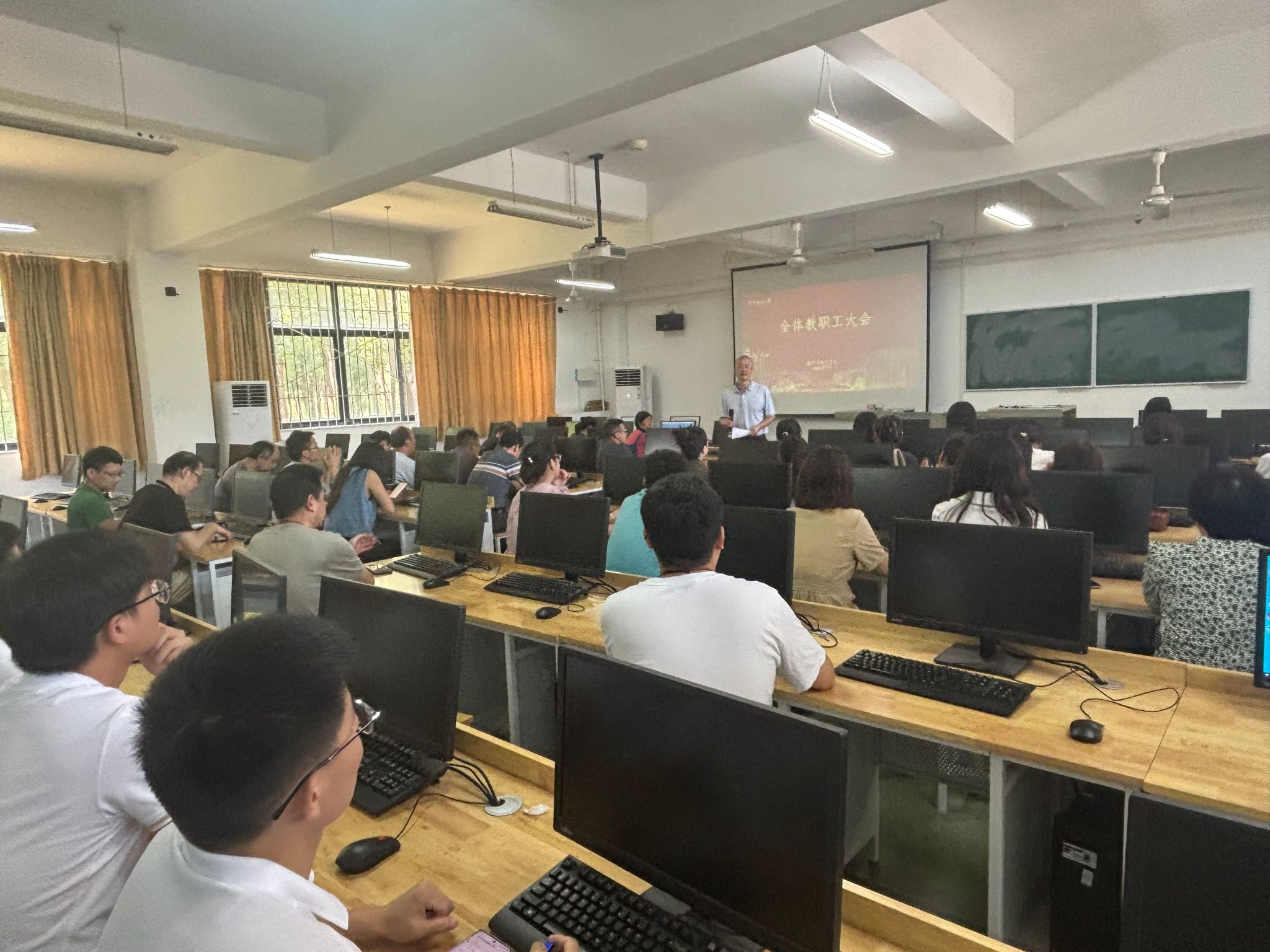 2025年7月5日下午,数学与统计学院在4号教学楼105室召开教职工大会,总结学期工作,布置暑假工作,开展师德师风专题教育,学院党委书记段溢波主持会议。
