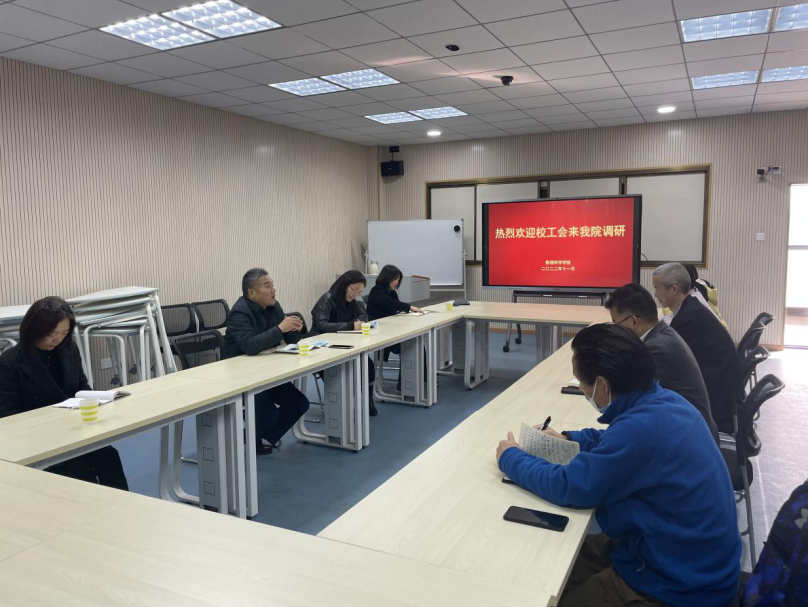 肖迪明一行从学院党政班子对工会工作的指导情况;学院工会日常工作开展情况;学院教工之家建设和特色活动开展情况;学院困难教职工现状;对校工会工作的建议等方面进行了详细调研并实地查看。周志刚汇报了学院工会工作,段溢波、汪胜祥、郑仟与校工会领导进行了深入交流。