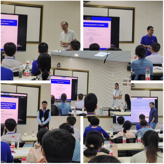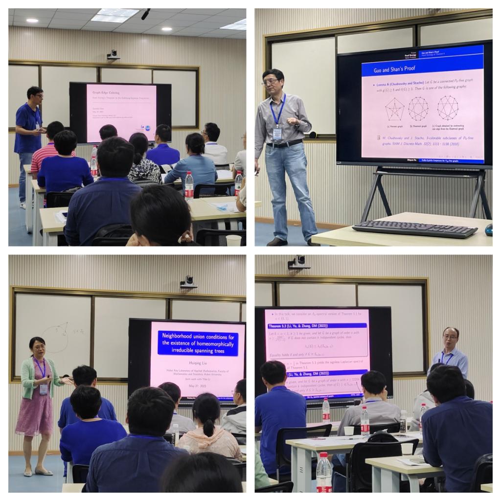 本次会议共设9场邀请报告,来自美国佐治亚州立大学陈冠涛教授,华中师范大学胡智全教授、湖北大学刘慧清教授和华中师范大学李书超教授分别作40分钟会议专题报告。来自中南民族大学朱忠熏教授、南京航空航天大学刘文忠副教授、南京林业大学戴国伟副教授、华中师范大学胡小兰副研究员和丁来浩博士分别作25分钟的报告交流。与会的各位专家学者围绕结构图论、代数图论、复杂网络、组合优化、网络设计与优化等热点问题开展积极交流。