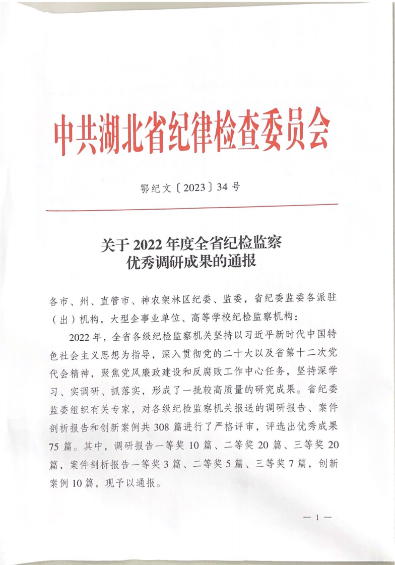 近日,中共湖北省纪委、省监委印发《关于2022年度全省纪检监察优秀调研成果的通报》,williamhill英国党委书记段溢波撰写的《新时代高校政治生态建设的根本遵循、现实困境与优化路径》荣获2022年度优秀调研报告二等奖。