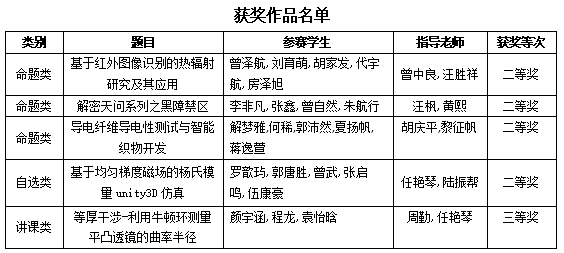 近日,全国第九届大学生物理实验创新设计大赛决赛在重庆大学圆满结束。我校5支代表队在本次大赛中获二等奖4项、三等奖1项,创我校参赛以来获奖数最多,学校获优秀组织奖。