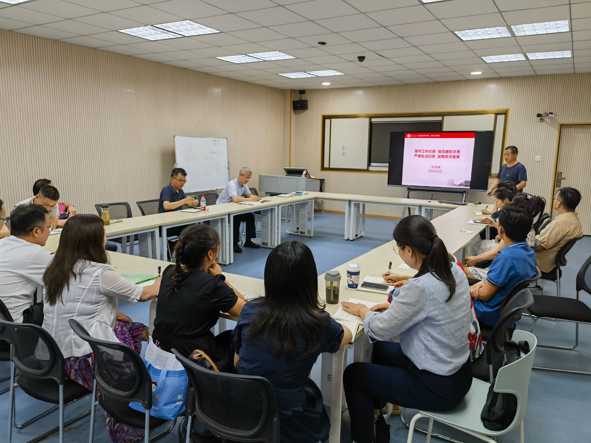 2024年6月20日中午,williamhill英国在崇文楼206室举办工作纪律、生活纪律学习专题班暨党委理论学习中心组第五次集体学习。学院党委委员、系(中心、办)主任、党支部书记、党支部委员参加学习。学院党委副书记陈国鹏以《恪守工作纪律,规范履职尽责;严明生活纪律,发挥党员表率》为题做辅导报告,学院党委书记段溢波主持学习会。