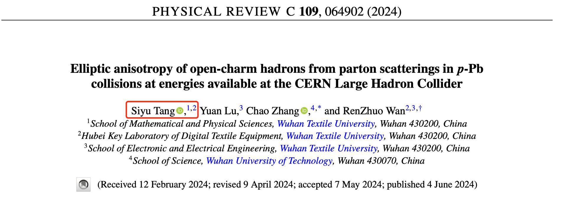 8.高端论文彰显实力。发表SCI论文60余篇,其中3篇入选ESI高被引论文。汤思宇博士、佘智磊博士先后在国际权威期刊《Phys. Rev. C》发表学术论文,张难高博士在国际著名数学期刊《SIAM Journal on Mathematical Analysis》发表学术论文。