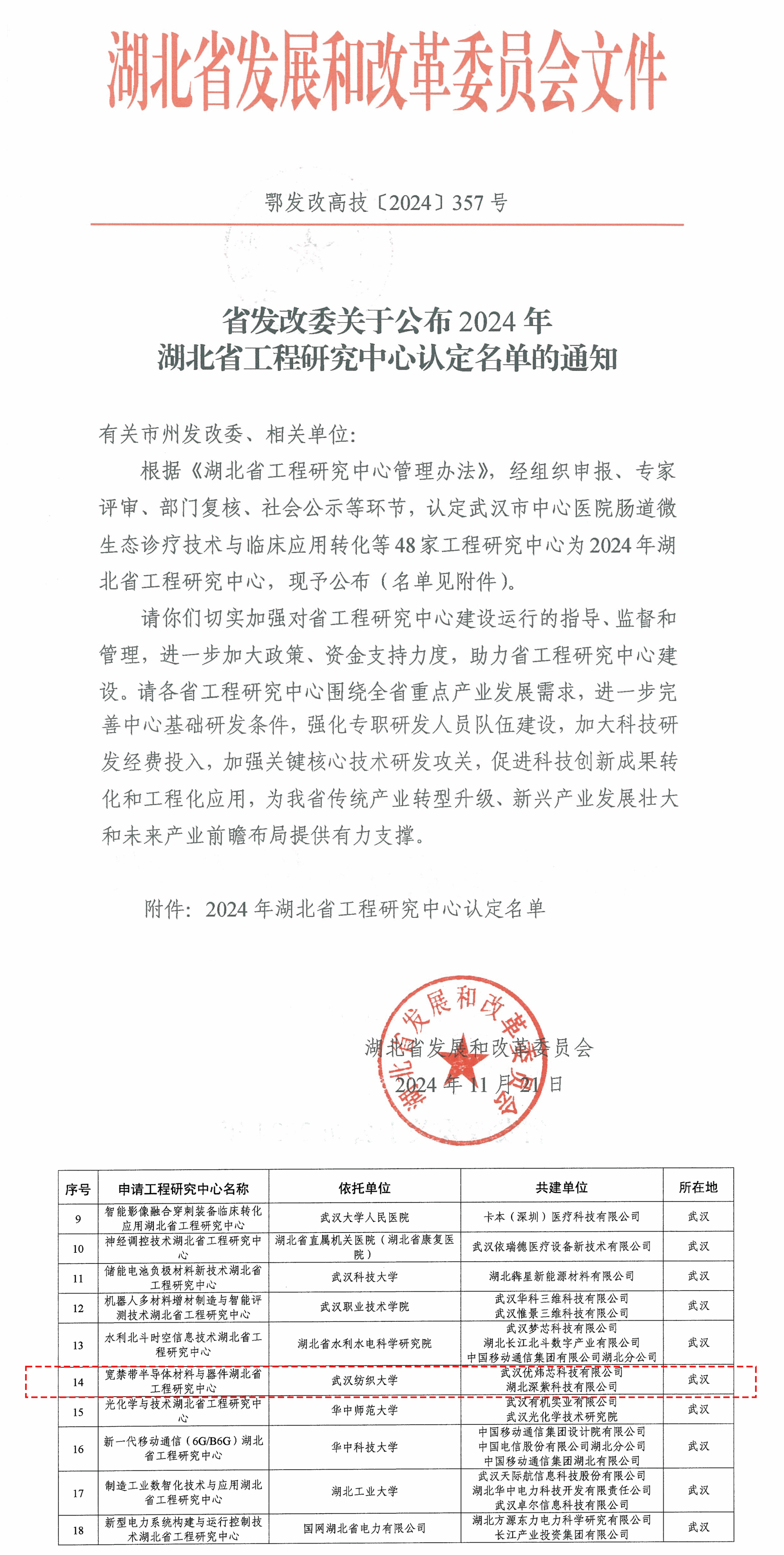 省级科研平台从零到一。获批“宽禁带半导体材料与器件湖北省工程研究中心”,该工程中心由学校联合武汉优炜芯科技有限公司、湖北深紫科技有限公司申报,挂靠在微电子学院,由微电子学院院长陈长清担任主任。
