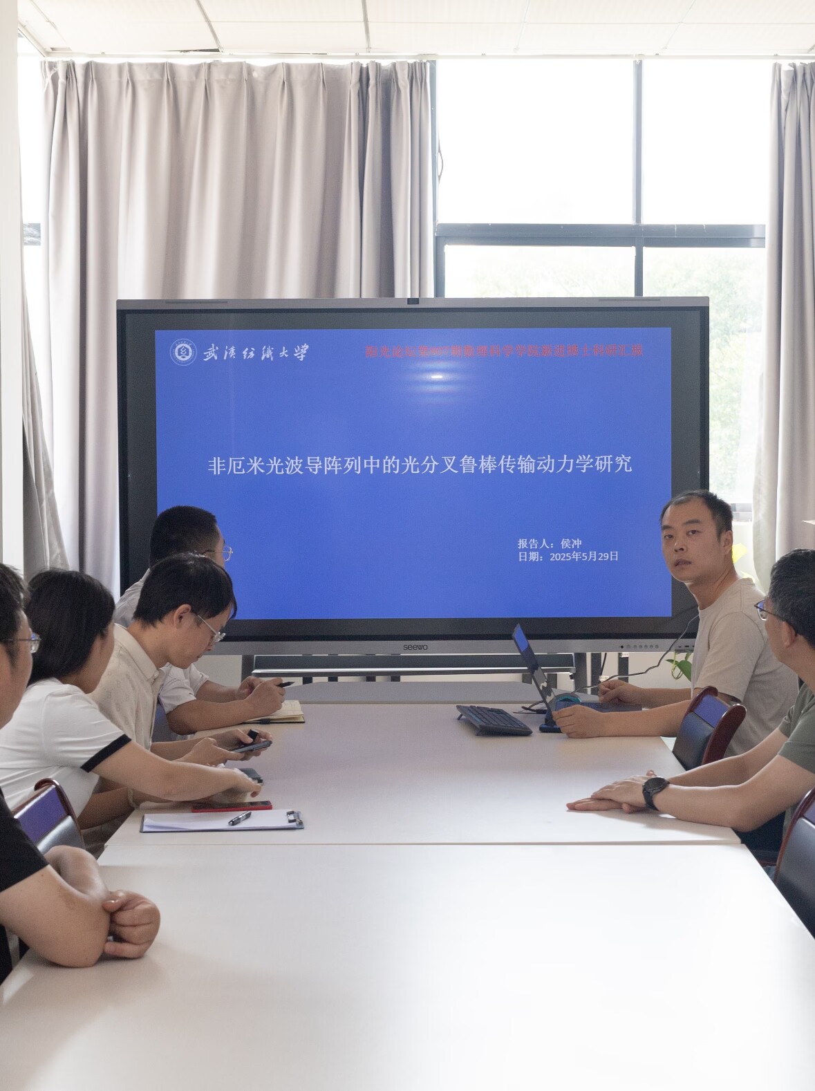 汇报会上,侯冲老师以扎实的专业知识和深入浅出的讲解方式,围绕波导系统展开论述。他从波导系统的基本概念、发展历程讲起,详细介绍了自己在该领域的研究方向与最新成果。侯冲老师指出,波导系统在现代通信、雷达等众多领域有着广泛应用,其性能的优化对推动相关行业发展至关重要。在汇报中,他深入分析了光在波导阵列系统中受非厄米性影响的传输机理,并结合自己的研究展示了一系列创新性的解决方案,为波导系统的研究与应用提供了新的思路。