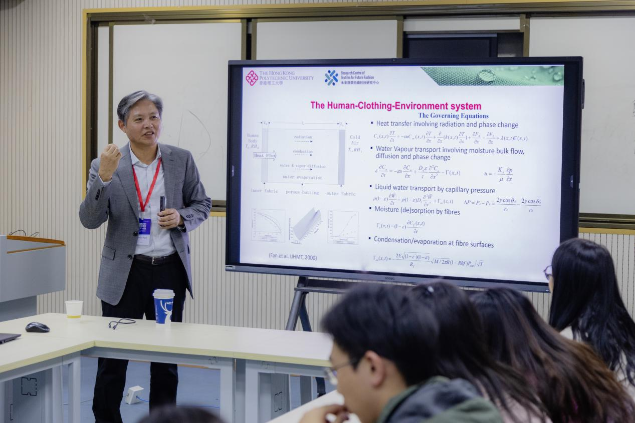 范金土教授在报告中系统阐述了纤维材料热质传递建模领域所面临的核心挑战。他从传导、对流、辐射、蒸发等多个物理过程出发,深入剖析了多物理场耦合、微观—宏观尺度关联等关键科学问题,并分享了其团队在相关领域的最新研究进展,为在场师生拓宽了科研视野,也指明了可能的创新路径。