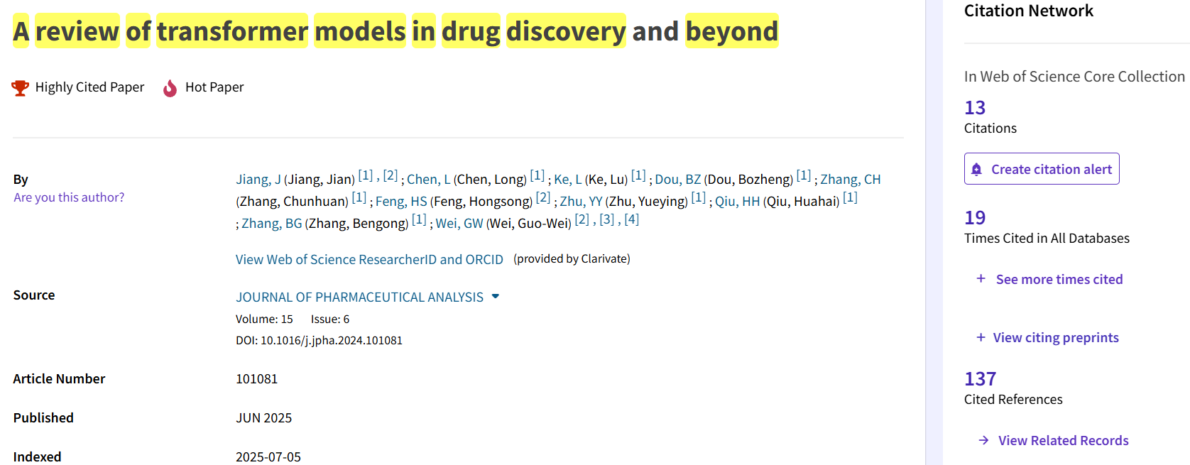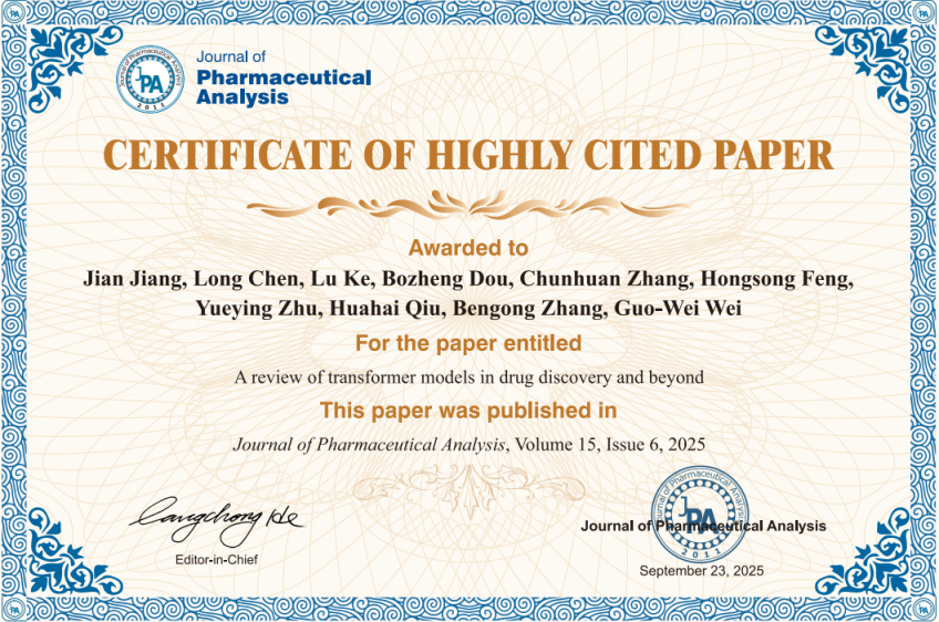 根据Essential Science Indicators(简称ESI)最新数据显示,我校数学与统计学院江健教授团队2025年6月发表在国际学术顶级期刊《Journal of Pharmaceutical Analysis》(中科院一区Top)的学术论文“A review of transformer models in drug discovery and beyond”(J. Pharm. Anal. 15, 6, 101081, 2025,文章链接https://doi.org/10.1016/j.jpha.2024.101081)成功入选药理学与毒理学领域ESI全球前0.1%热点论文。论文第一作者为江健教授,美国密歇根州立大学Guo-Wei Wei教授为通讯作者,William威廉英国为第一通讯单位。