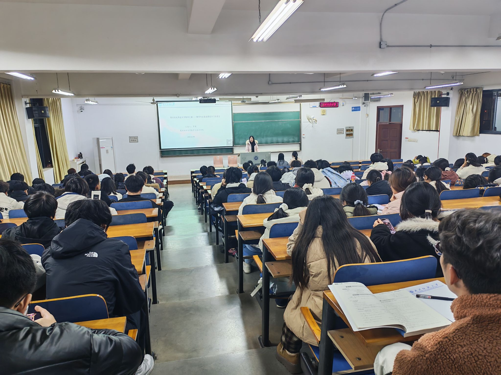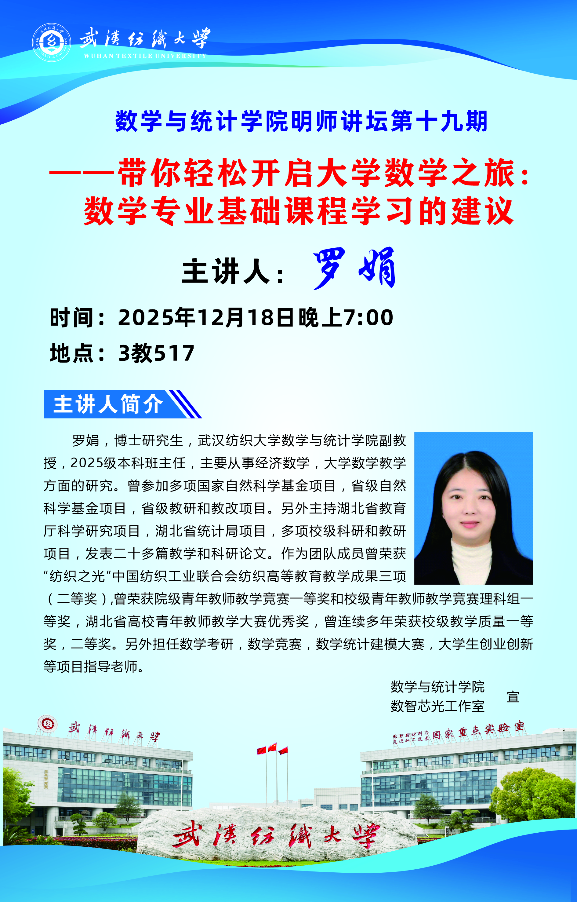 2025年12月18日晚上19:00,数学与统计学院“明师讲坛”系列活动在William威廉英国三号教学楼517室成功举办。本次讲座邀请到了深受学生喜爱的《数学分析》主讲教师——罗娟老师,以“夯实基础,规划未来——与大一同学谈数学学习与成长”为主题,与在场学子进行了一场真诚而富有启发的交流。讲座现场座无虚席,气氛温馨热烈。