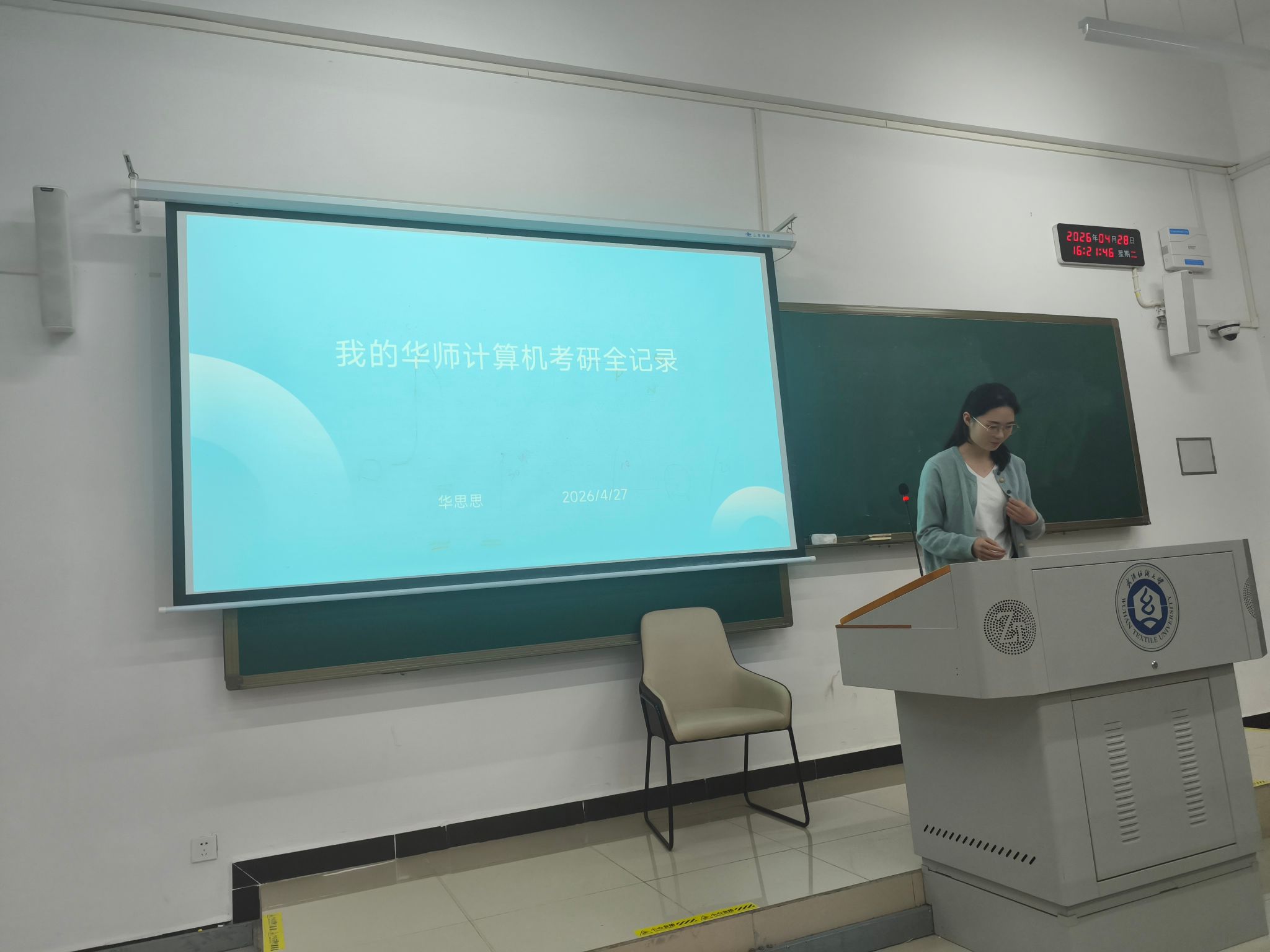 随后,信科12202班的华思思同学以《我的华师计算机考研全记录》为题,分享了跨专业考研408的备考经验。她结合自身跨专业备考的经历,分享了从决定跨考到备战华中师范大学计算机专业的心路历程与实战方法,并重点围绕计算机学科专业基础(408)的四个备考科目一一介绍了它们的复习顺序、重难点突破,进行了全方位拆解,为有跨考意向的同学提供了跨专业考研的实用路径与方法指导。