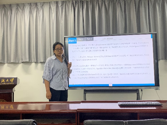 马璇博士进行了题为“有限管道上非截断Boltzmann方程解的性态研究”的报告。报告介绍了Boltzmann方程初边值问题的研究背景,通过对空间变量x引入一类新的函数空间,然后运用基本能量方法在inflow边界条件下给出非截断的Boltzmann方程在有限管道中解的性态研究(包括解的全局存在唯一性,大时间行为以及解的正则性传播结果)。最后,老师们就相关问题进行了充分的交流和讨论。