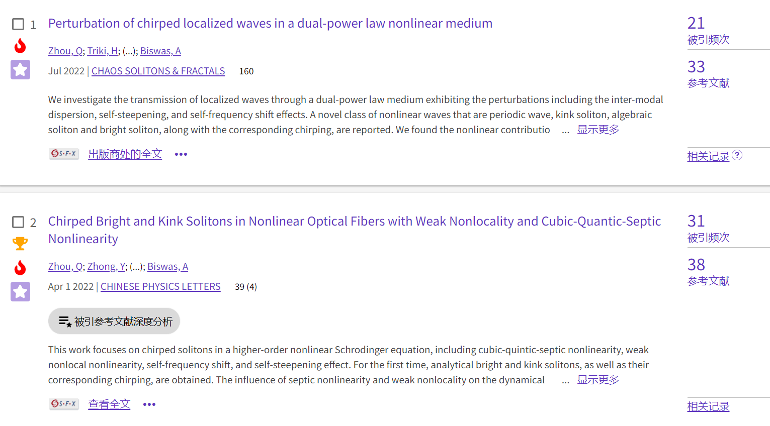 高非线性介质中局域波的传输特性是非线性科学领域的研究热点。团队分别报道了“三次-五次-七次”非线性光纤、双幂类非线性介质中存在的精确啁啾孤子,揭示了自频移效应和自陡峭效应是引起非线性啁啾的原因,提出了利用非线性效应对孤子脉冲进行压缩的技术方案。上述成果均进入物理学领域最优秀的1‰之列,入选ESI热点论文,其中论文Chaos, Solitons & Fractals 2022;160:112198以williamhill英国和纺织新材料与先进加工技术国家重点实验室分为第一和第二署名单位。