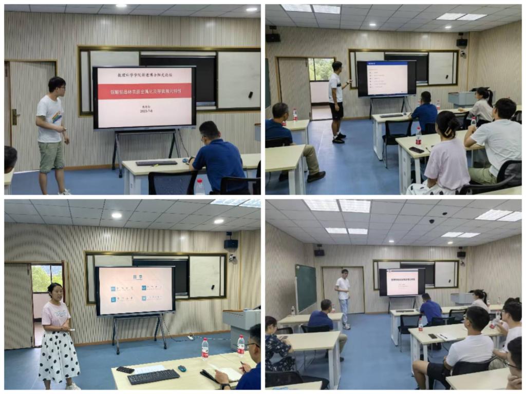 2023年新进4位博士依次进行交流,博士毕业于北京航空航天大学的刘飞艳老师介绍了非线性局域波的概念和广泛的存在性,然后基于流体力学相关模型分析了非线性局域波的产生机制和相互作用性质。