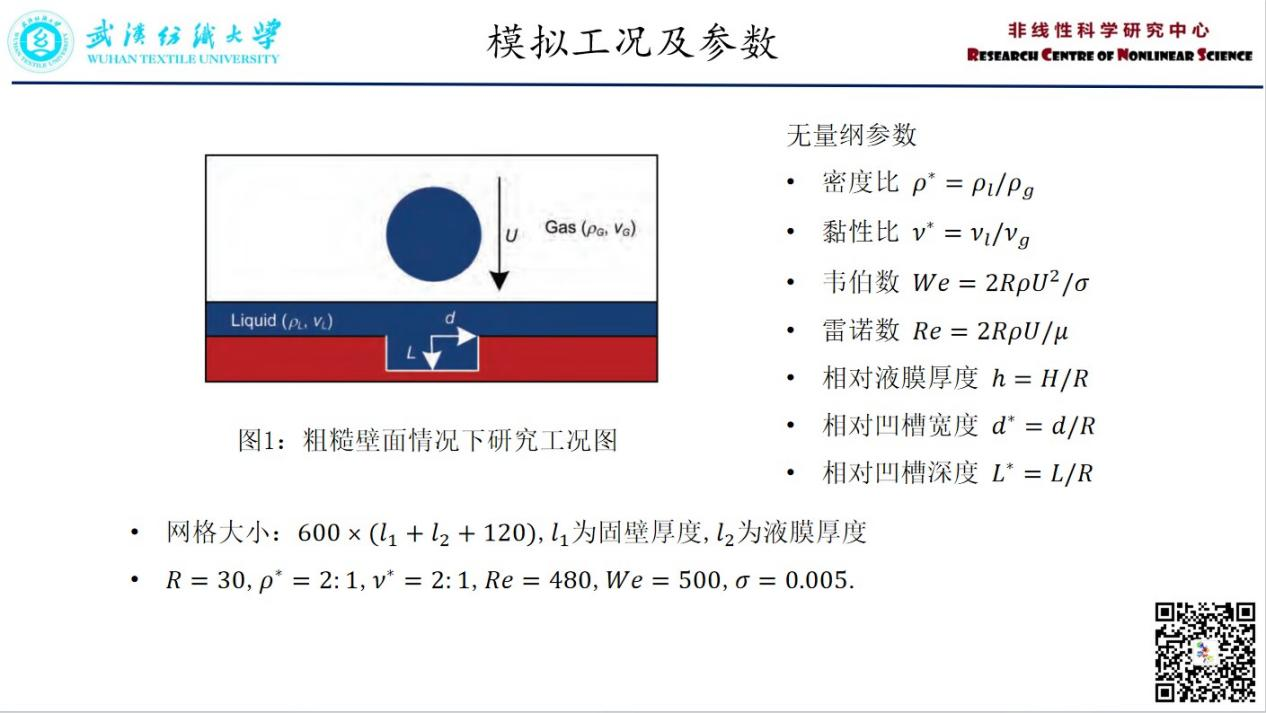 周锐:采用格子Boltzmann方法对液滴撞击粗糙壁面上液膜的过程进行了研究,主要考察了相对液膜厚度h、相对凹槽宽度d*、相对凹槽深度L*等物理参数对界面运动过程的影响。相对液膜厚度h<2时,形成的水花发生卷吸现象后会产生飞溅现象h≥2时,形成的水花不会发生飞溅现象。相对凹槽宽度d*≤3时,由液体溅起形成的水花会在剪切力的作用下发生“飞溅”现象,当d*>3时,形成的水花在表面张力的作用下发生“断裂”现象。相对凹槽深度L*对水花的形成影响较小,但对水花的飞溅现象影响较大。