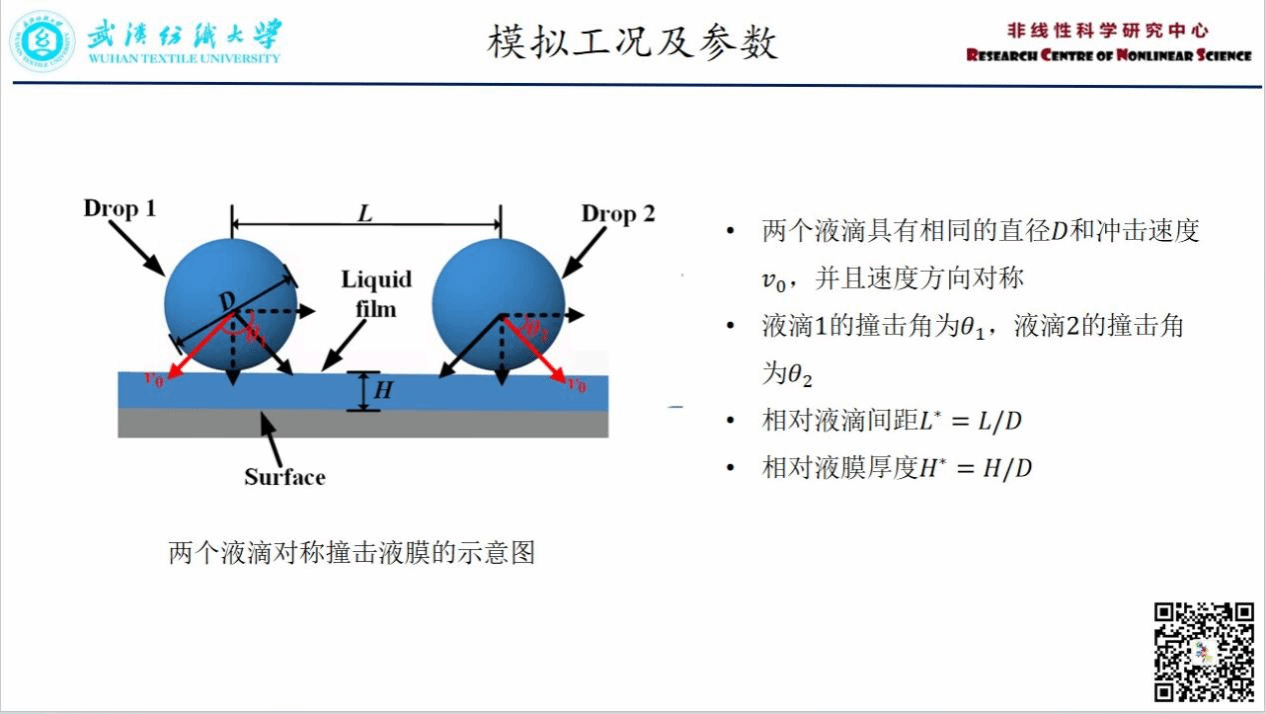 周锐:本次组会中讲解了液滴对称撞击液膜的数值模拟分析。在本研究中,用CLSVOF方法来捕捉多液滴撞击液膜的气液界面变化。当两个液滴撞击液膜时,分析了三种撞击模式(垂直撞击、对称向内撞击和对称向外撞击)下的形态变化。三种撞击模式的形态明显不同。两个液滴的向内撞击促进飞溅,而向外撞击则抑制飞溅;液膜厚度主要影响局部飞溅形态;液滴间距影响扩散直径和射流角度。