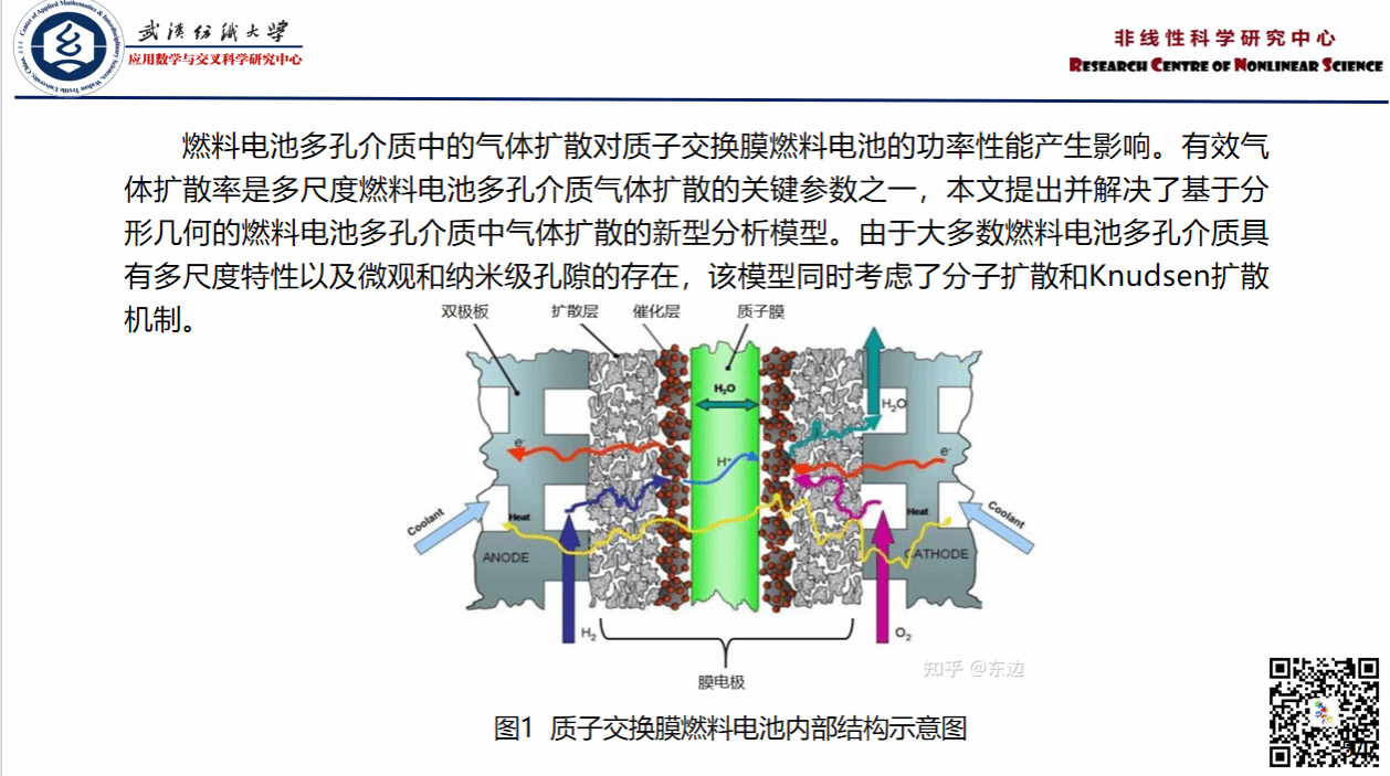 徐静蕾:本次组会介绍了一篇多尺度燃料电池多孔介质中气体扩散的新型分析解。本文提出并解决了基于分形几何的燃料电池多孔介质中气体扩散的新型分析模型。由于大多数燃料电池多孔介质具有多尺度特性以及微观和纳米级孔隙的存在,该模型同时考虑了分子扩散和Knudsen扩散机制。我们推导出了多尺度多孔介质的有效气体扩散率表达式,其中涉及到批量扩散、孔隙结构以及Knudsen数。所提出的分形模型通过与现有实验数据和经验相关性进行比较进行验证。该模型显示,有效气体扩散率随着孔隙率和孔隙分维的增加而增加,而随着迂曲分维的增加而减小。相信本研究成果可以为燃料电池多孔介质中的气体扩散机制提供启示。