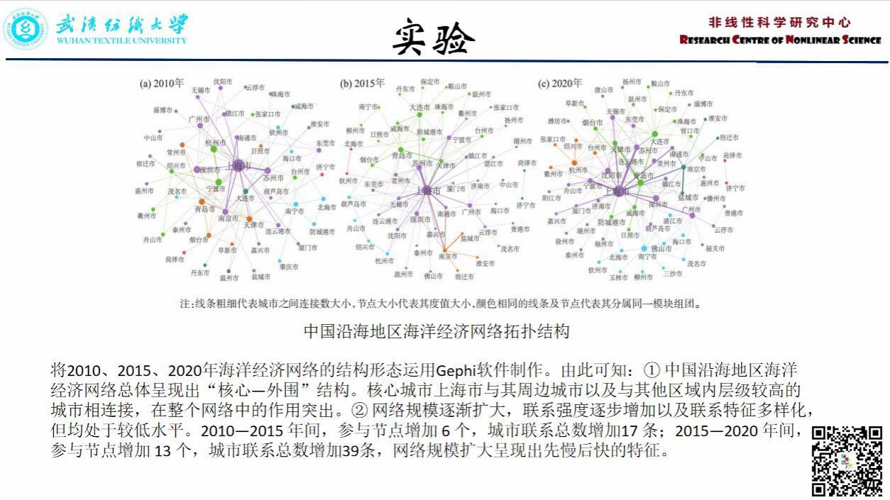 汪玉婷:本次汇报了《基于涉海A股上市公司的中国沿海地区海洋经济网络结构韧性演化研究》:论文从海洋经济网络结构视角开展韧性研究,运用涉海A股上市公司及其子公司信息构建海洋经济网络,分别从层级性、匹配性和传输性3个维度对2010、2015、2020年海洋经济网络结构韧性进行评价。结果表明:① 中国沿海地区海洋经济网络层级性提升,区域绝对极化与相对均衡化并存;② 匹配性由同配性转变为异配性,核心城市与边缘城市的联系增强;③ 传输性总体上处于较低水平,但具有提升之势;④ 层级性、异配性与传输性的增强提升了海洋经济网络的凝聚性、创新性与开放性,使中国沿海地区海洋经济网络结构韧性得到增强。研究旨在丰富经济地理学韧性研究以及为海洋经济安全发展提供一定的研究基础和参考依据,以期助力海洋经济高质量发展。