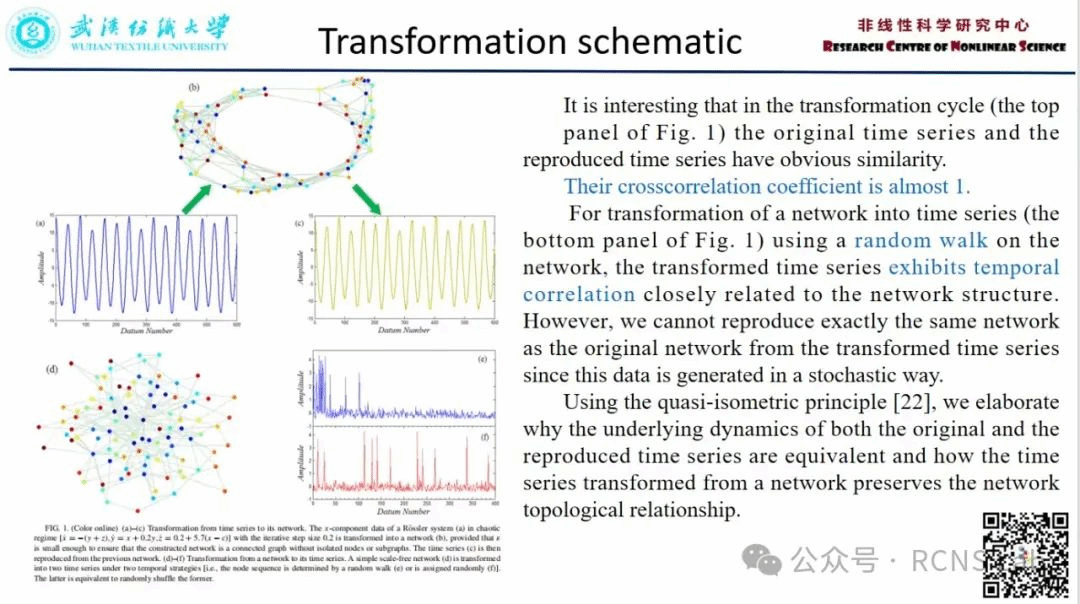 牛浩瀛:本次汇报了一篇文献《Geometrical invariability of transformation between a time series and a complex network 》,基于粗几何理论,我们给出了时间序列和复杂网络之间的动态等价变换。根据拟等距同构映射,我们描述了复杂系统的基本几何特征。分形维数对于时间序列(或复杂网络)及其变换后的对应物是相同的。来自罗斯勒系统、分数布朗运动、合成网络和真实网络的结果支持了我们的发现。本文为时间序列与网络之间的等价变换提供了理论证据。