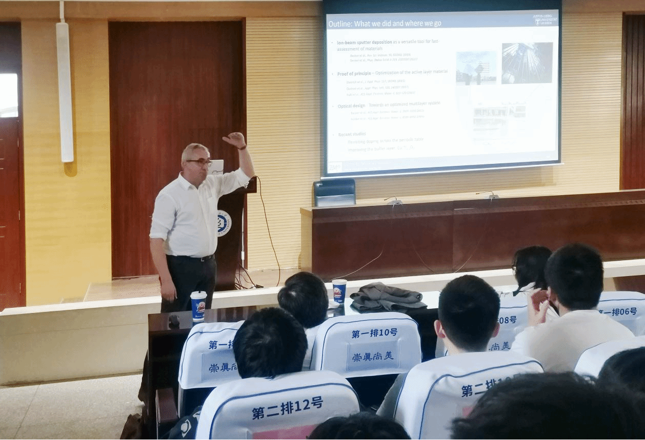 Peter J. Klar教授立足全球能源危机背景,系统阐述了二氧化钒(VO2)材料的金属-绝缘体相变特性及其在智能窗领域的应用前景,重点报告了其团队在该领域的相关研究进展。针对VO2材料产业化过程中面临的光学性能优化与规模化制备难题,Peter J. Klar教授研究团队创新性提出多层膜结构解决方案:通过在VO2功能层上下构筑减反层和过渡层,实现了具有高可见光透过率和强太阳能调制能力的VO2基热致变色多层膜智能窗涂层系统;此外,通过引入TiO2:Cu薄膜作为缓冲层,成功将VO2薄膜生长温度降至300 °C,为VO2薄膜工业化生产提供借鉴。整场报告学术氛围浓厚,师生反响热烈;在互动交流环节中,与会师生就VO2在智能窗应用方面面临的关键技术问题与Peter J. Klar教授展开了深入探讨。