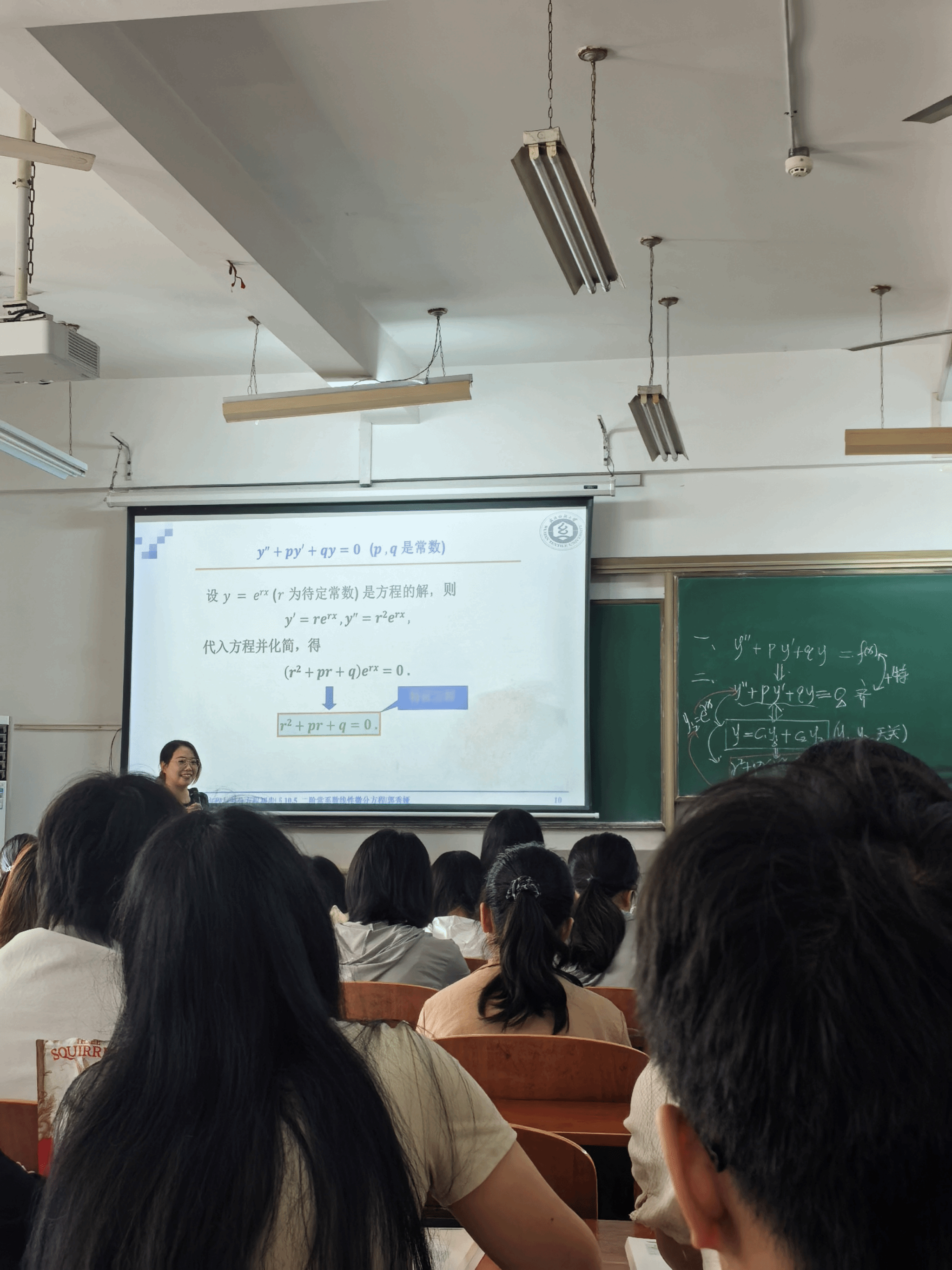 在下午的课堂上,张群娇老师重点讲解了形如y’+P(x)y=Q(x)的方程解法,创新采用“问题链”教学法,将积分因子法的推导分解为三个梯度性问题,逐步引导学生推导方程解法,在互动问答间加深学生对知识的理解。课堂氛围活跃,学生积极参与讨论,有效提升了学习效率。