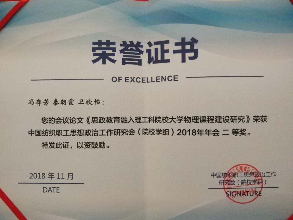 经专家组审核评议,我院推荐大学物理课程思政教学团队成员冯存芳老师的论文《思政教育融入理工科院校大学物理课程建设研究》荣获二等奖。此次获奖充分彰显了我院教师扎实的思想政治工作理论功底和教学素养,对推进课程思政教学改革的全面实施,打造物理课程与思政理论课同向同行、协同育人的新格局打下了坚实的基础。