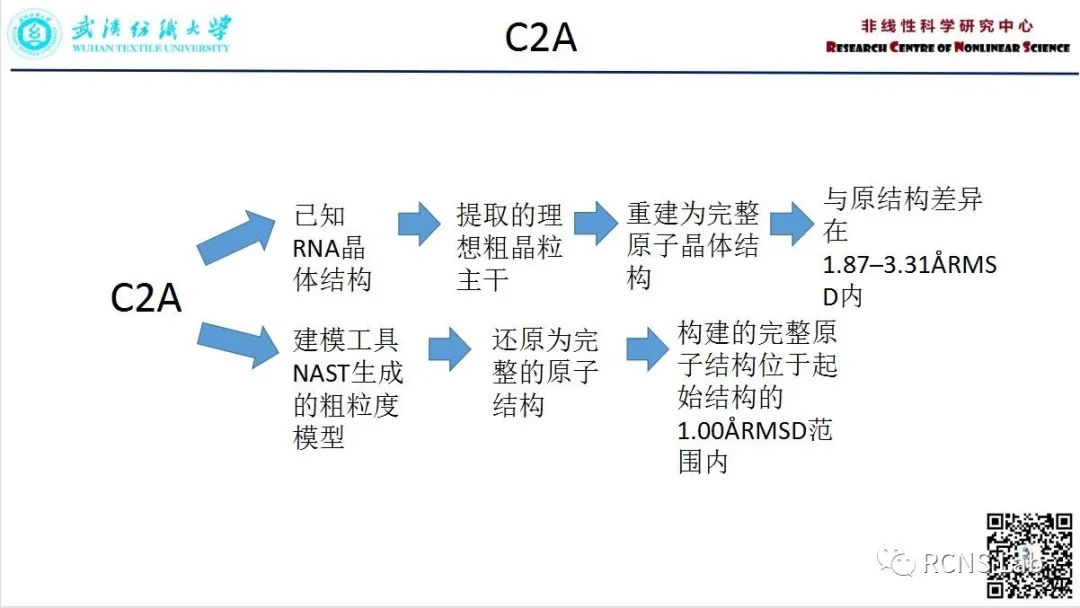 吴昊:本次汇报的文献为《C2A:基于已知的全原子还原粗粒化RNA3D结构》。使用粗粒度方法对RNA 3D结构进行建模的方法不断发展,需要在低分辨率和高分辨率建模方法之间架起桥梁。虽然粗粒度模型包含拓扑信息,但缺乏原子细节,这限制了它们在某些应用中的实用性。C2A可以使用任何基于原子的粗粒度结构模板作为输入,并提供一个全原子、能量最小化的结构作为输出。利用RNA晶体结构的几何信息来重建完整的原子细节,已经在70到244个残基大小的分子的理想粗颗粒结构上,以及在NAST生成的每残基一点粗颗粒tRNA模型上测试了C2A方法。除了提高粗粒度建模方法的实用性外,该工具还有潜力将计算成本高但精度高的全原子建模方法与快速但细节差的粗粒度建模方法联系起来。
