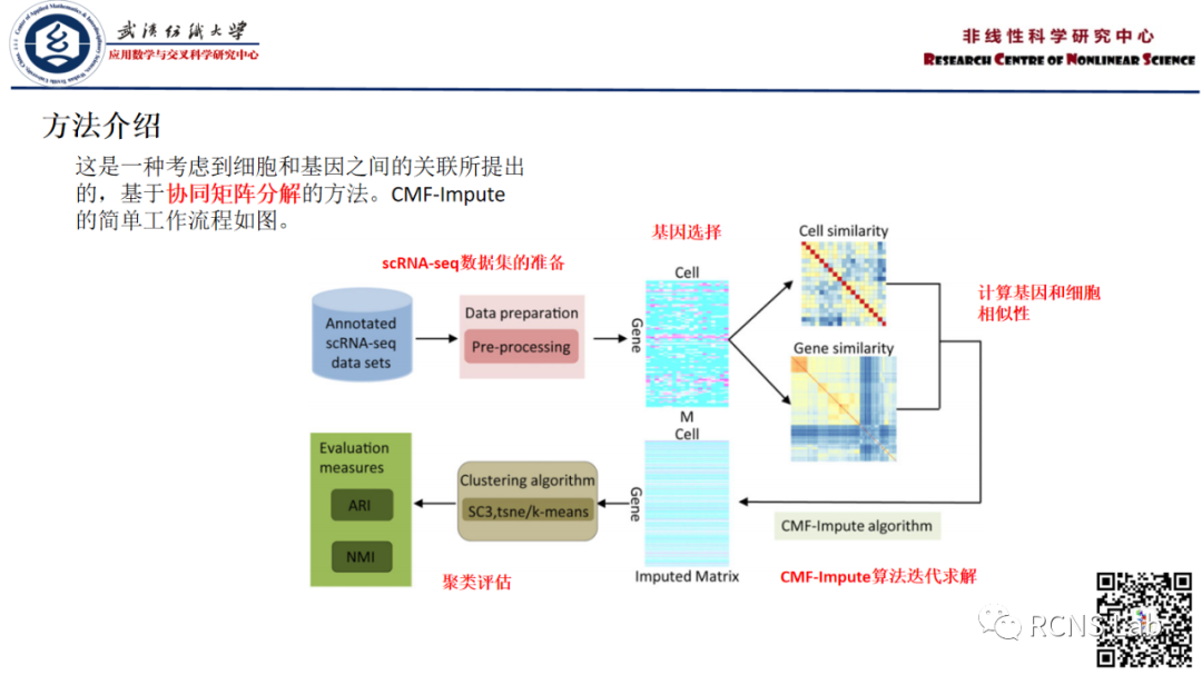 熊珍珍(线上汇报):该文献是考虑基因和细胞之间的关联提出的基于协同矩阵分解的单细胞测序数据插补方法。该方法首先将所使用的数据集按照细胞标记的可信度分为金银铜标准,接下来通过三个相似度度量:欧几里得距离,切比雪夫距离和皮尔逊相关系数,分别计算细胞相似性矩阵和基因相似性矩阵。CMF-Impute算法的目的,就是找出细胞特征矩阵和基因特征矩阵,使两个特征矩阵的乘积最接近原始矩阵,以此重新定义基因表达矩阵,最终达到数据插补目的。